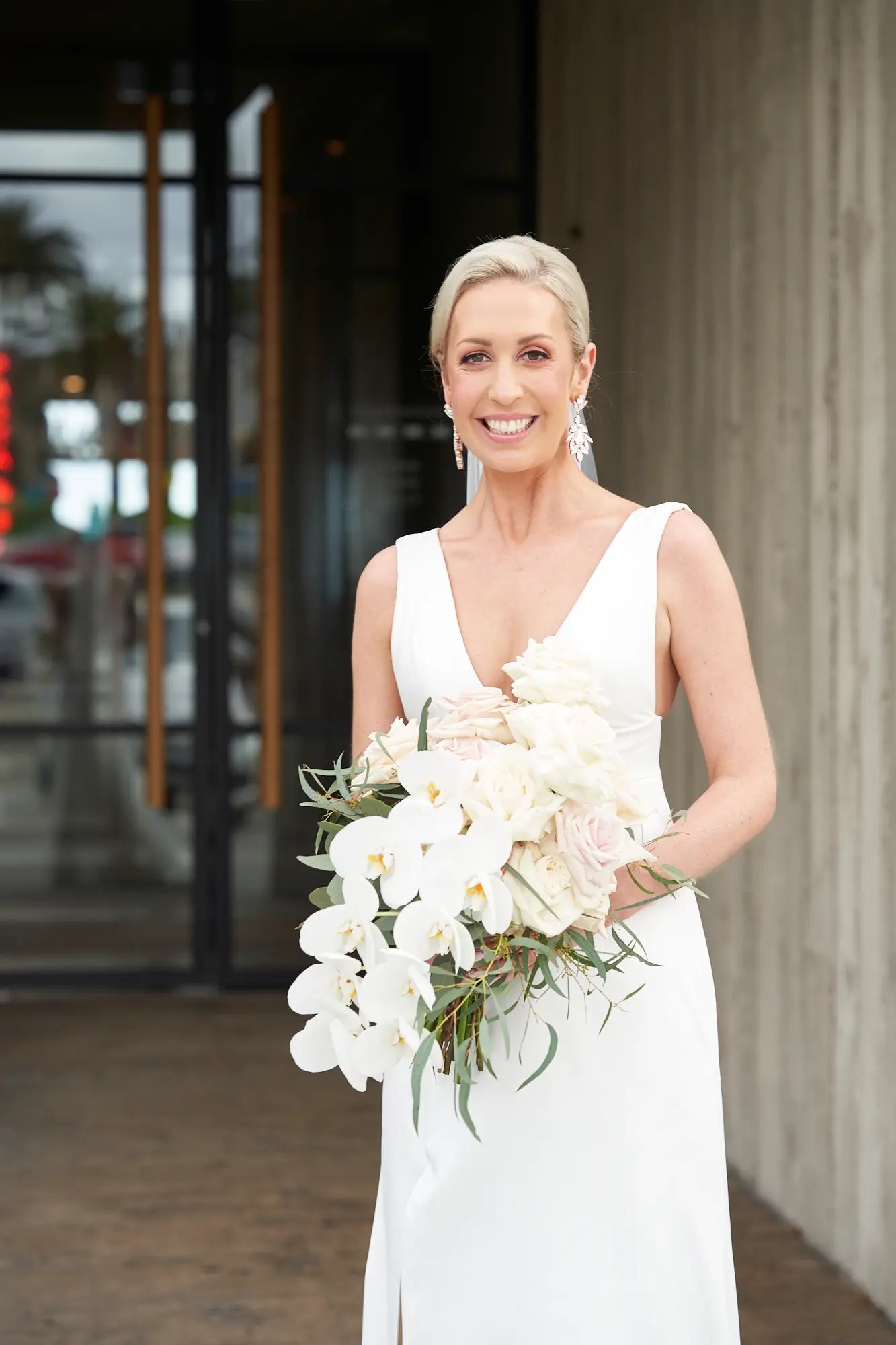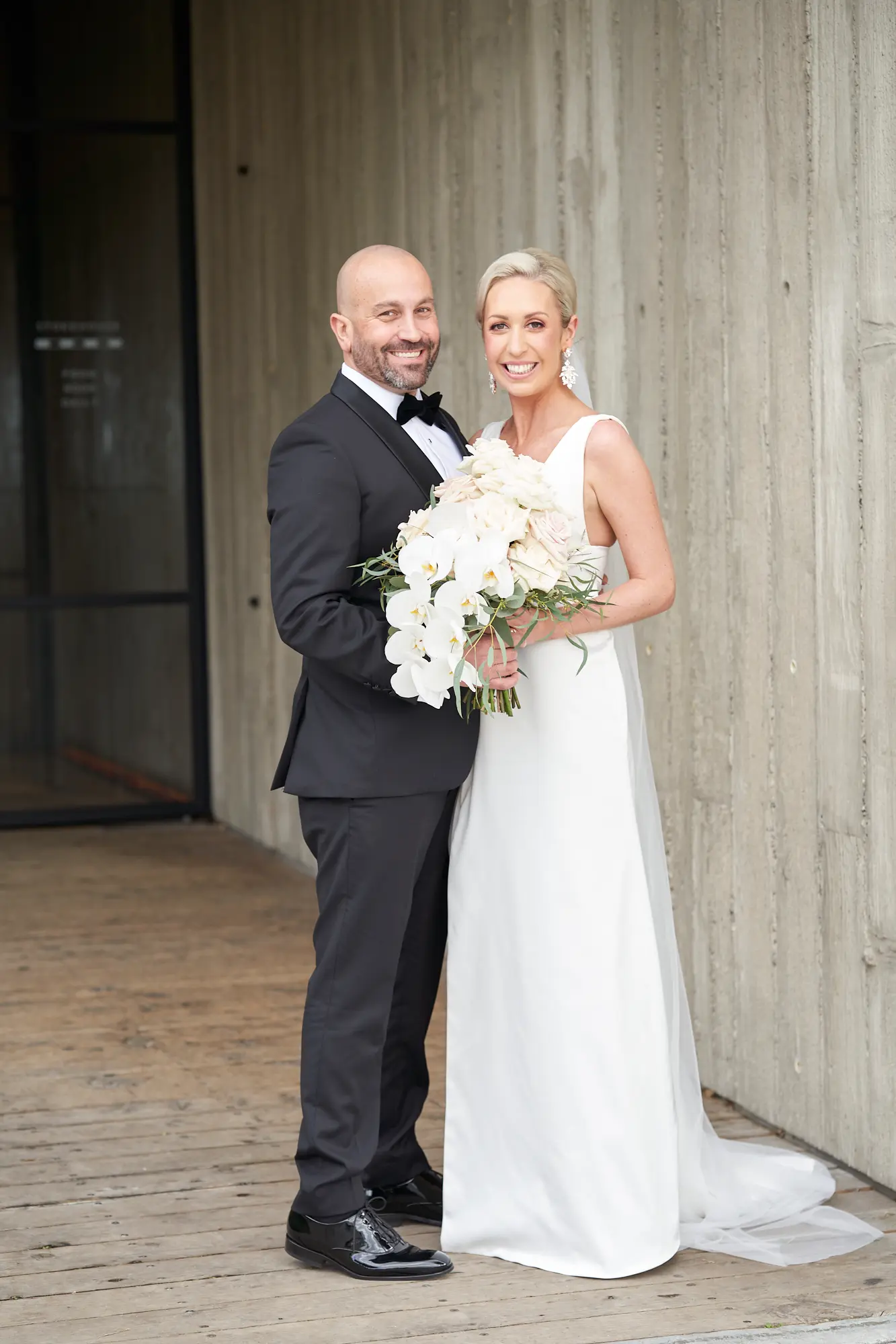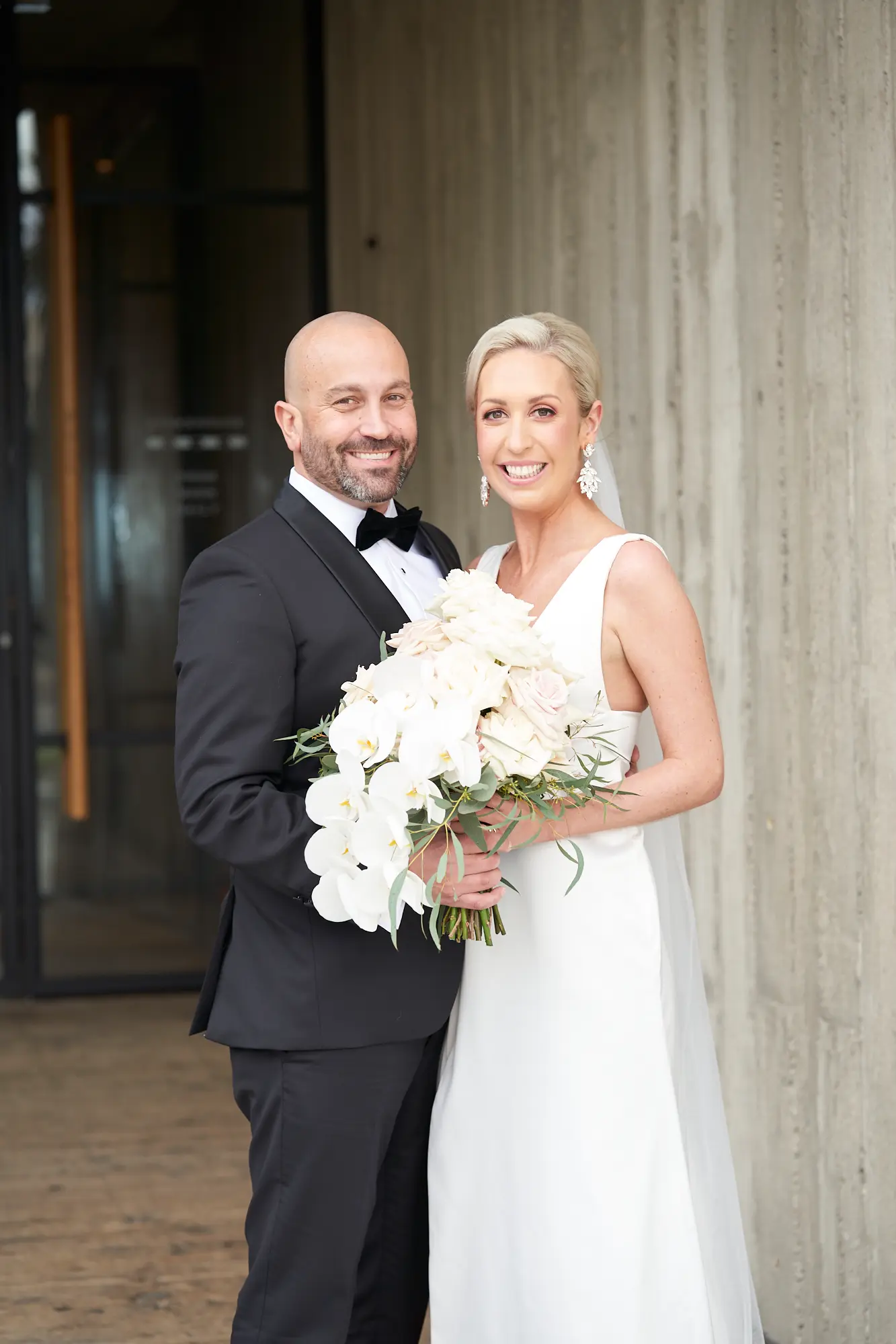 The clean lines of concrete and glass contrast beautifully with soft greenery, setting a tone of calm joy and contemporary elegance. Bathed in natural daylight, the couple stood effortlessly against the neutral palette, with Laura’s white dress and Adrian’s dark tuxedo creating a striking visual balance.