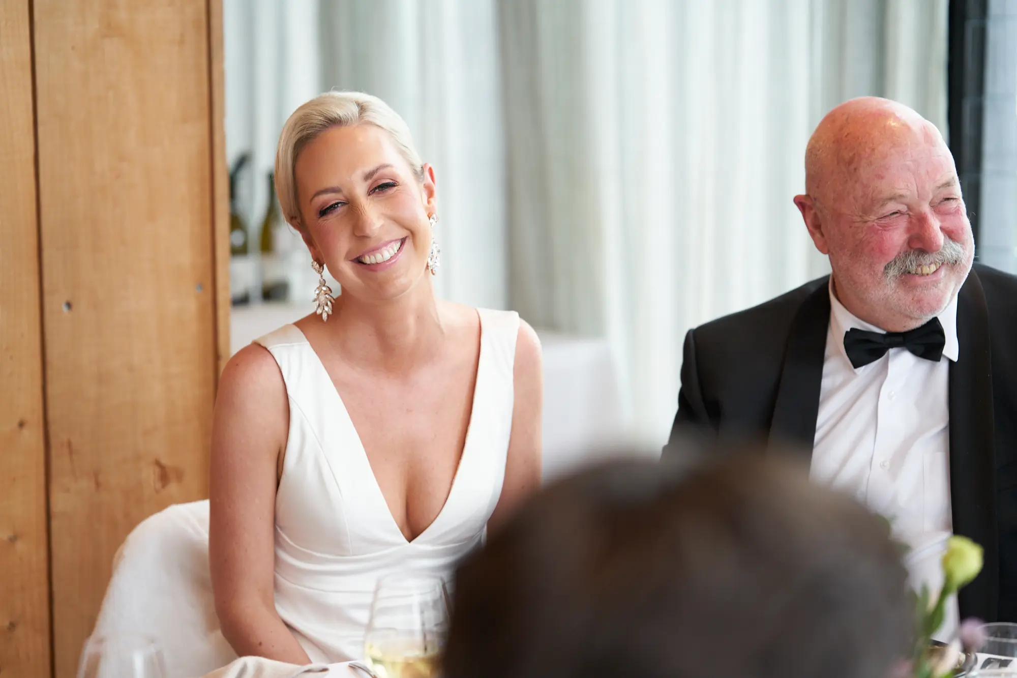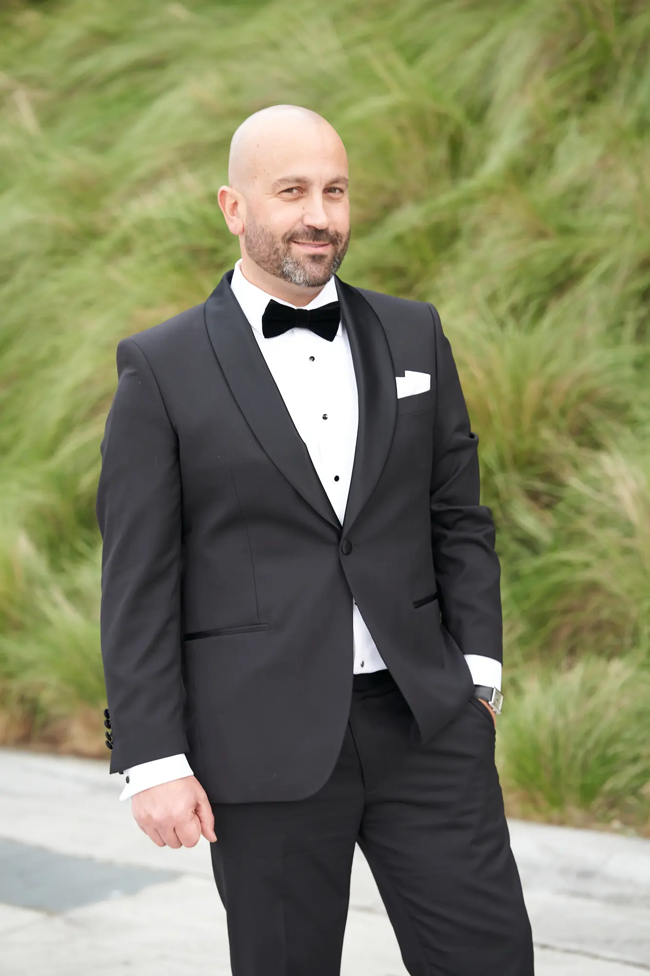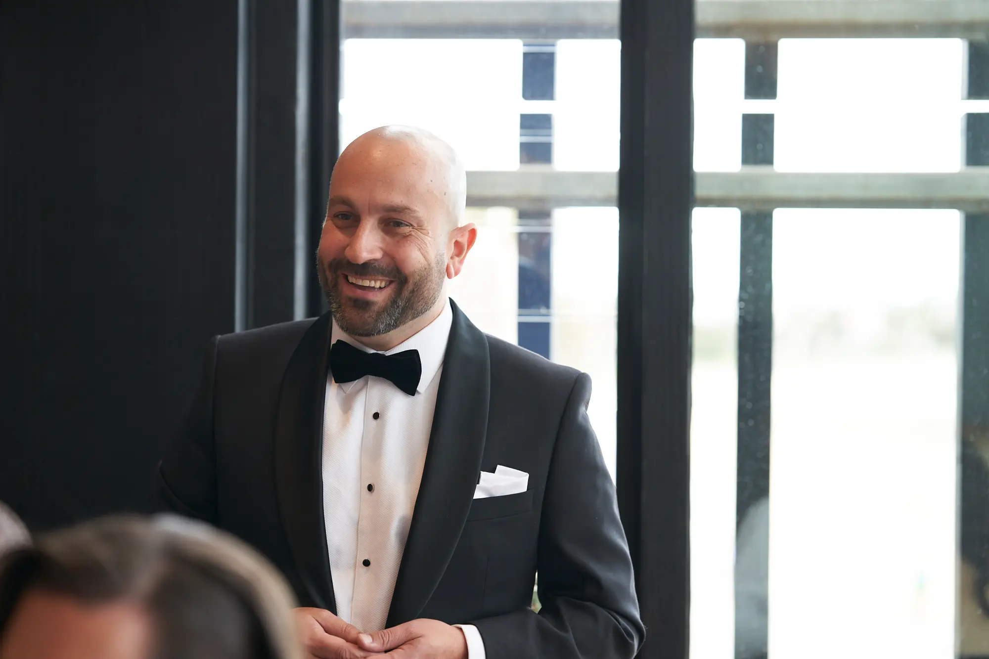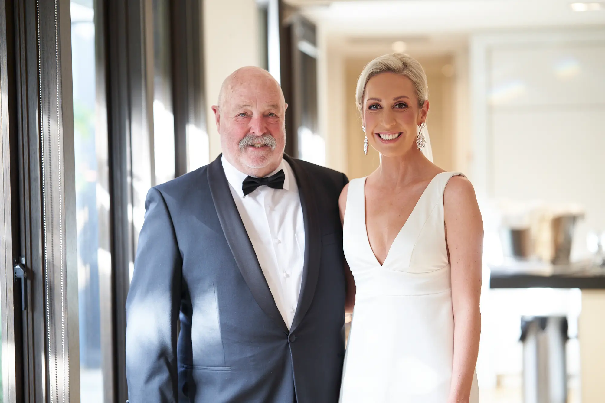 The clean lines of concrete and glass contrast beautifully with soft greenery, setting a tone of calm joy and contemporary elegance. Bathed in natural daylight, the couple stood effortlessly against the neutral palette, with Laura’s white dress and Adrian’s dark tuxedo creating a striking visual balance.