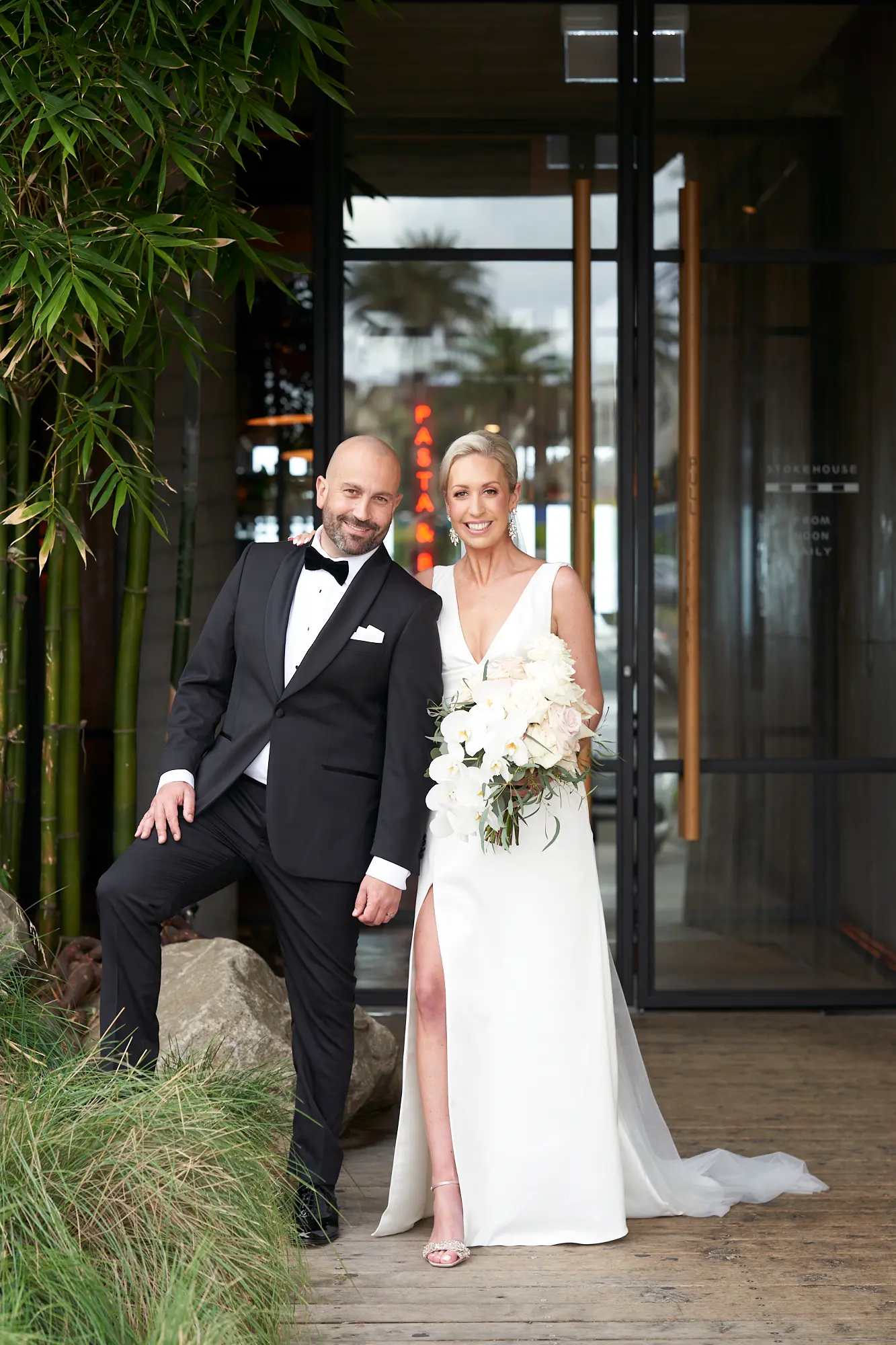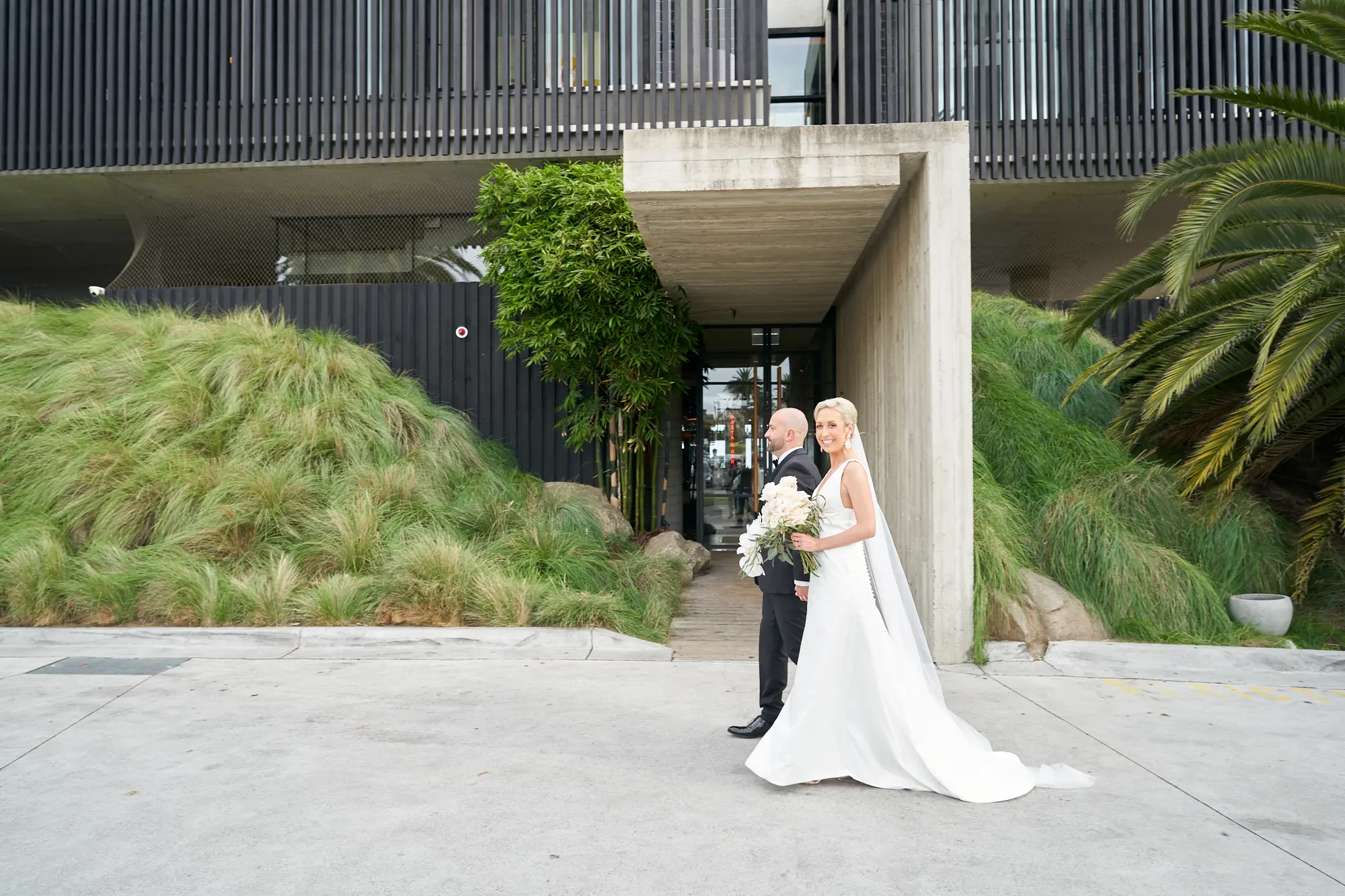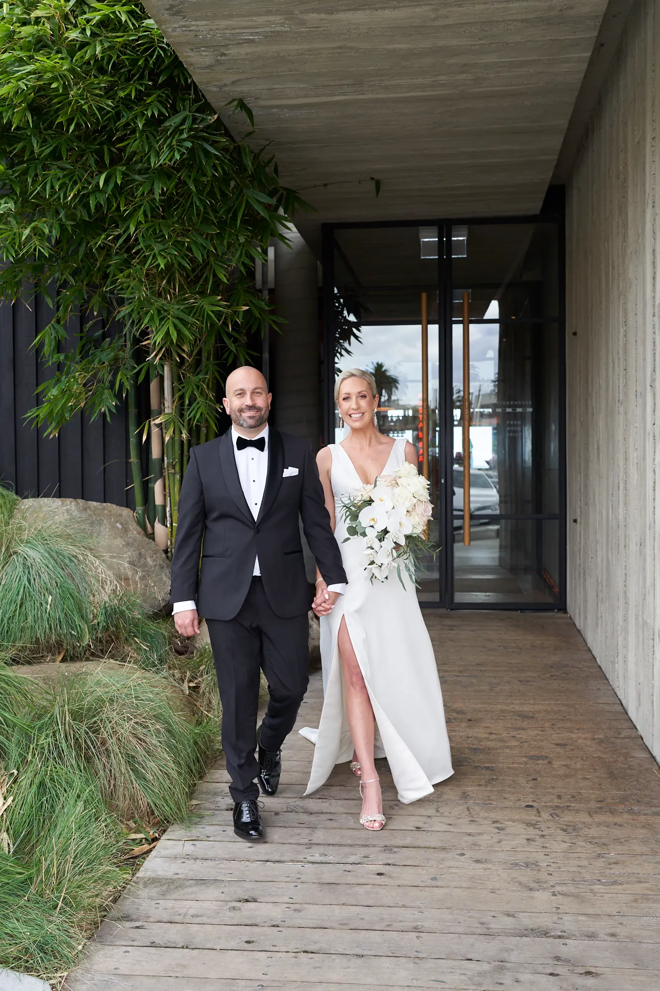 Adrian and Laura’s bride and groom portraits at Stokehouse St Kilda were defined by simplicity, calm, and modern elegance. Standing in front of the glass façade and bamboo-lined architecture, they created a striking yet understated image — Laura smiling gently while holding her bouquet, Adrian standing confidently beside her. The clean architectural lines paired with lush greenery offered a refined, contemporary backdrop that felt both luxurious and timeless. As they walked toward the camera, relaxed and smiling, the moments felt effortless and natural. These portraits embrace stillness and movement equally, capturing a sense of quiet celebration within a modern Melbourne setting.