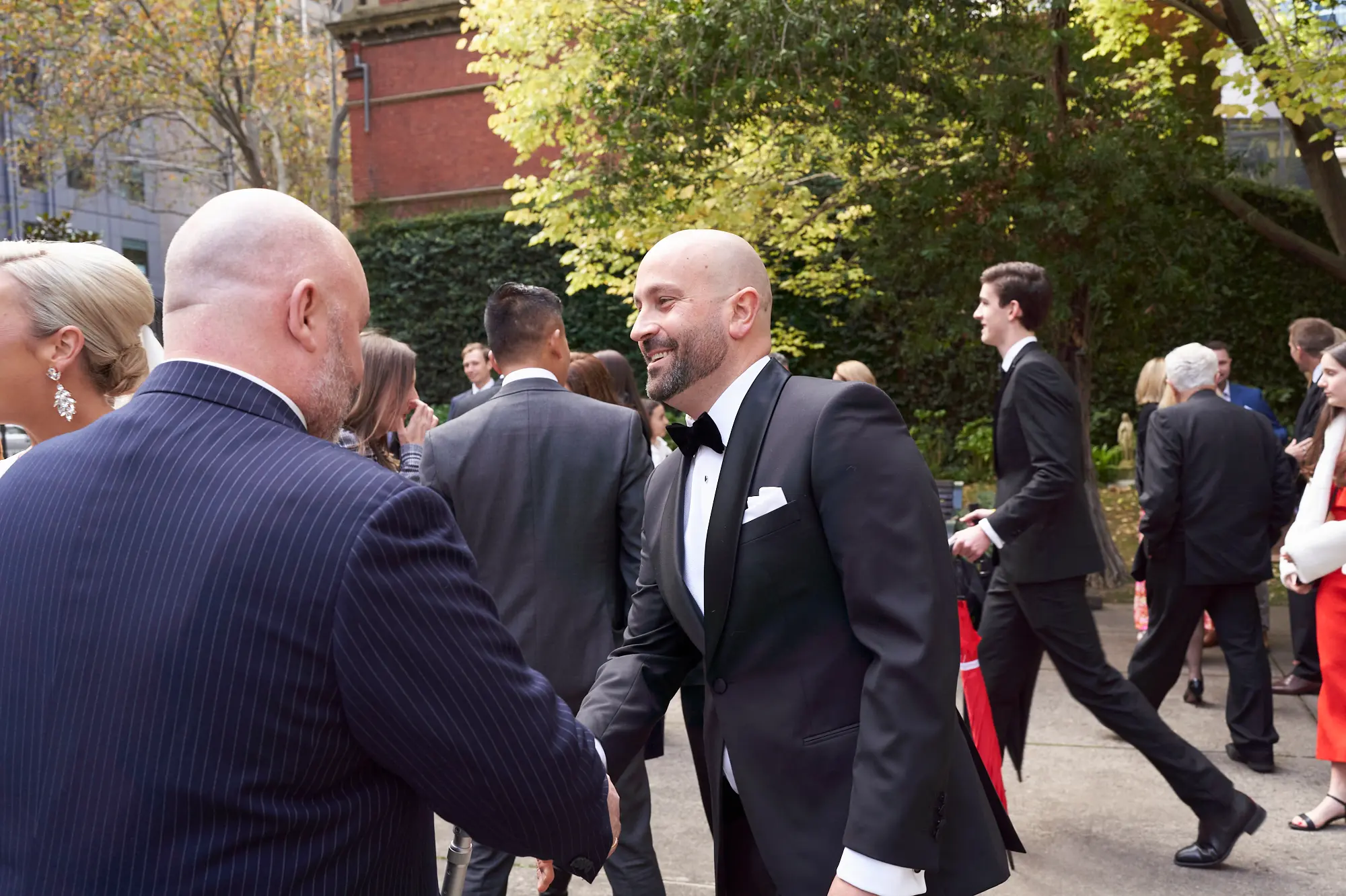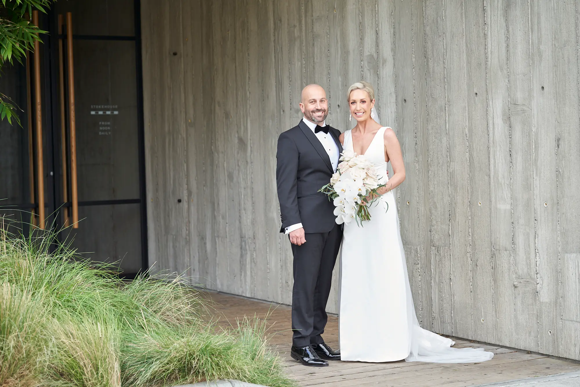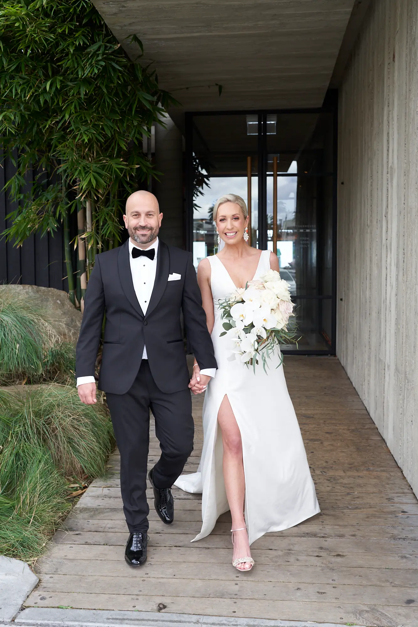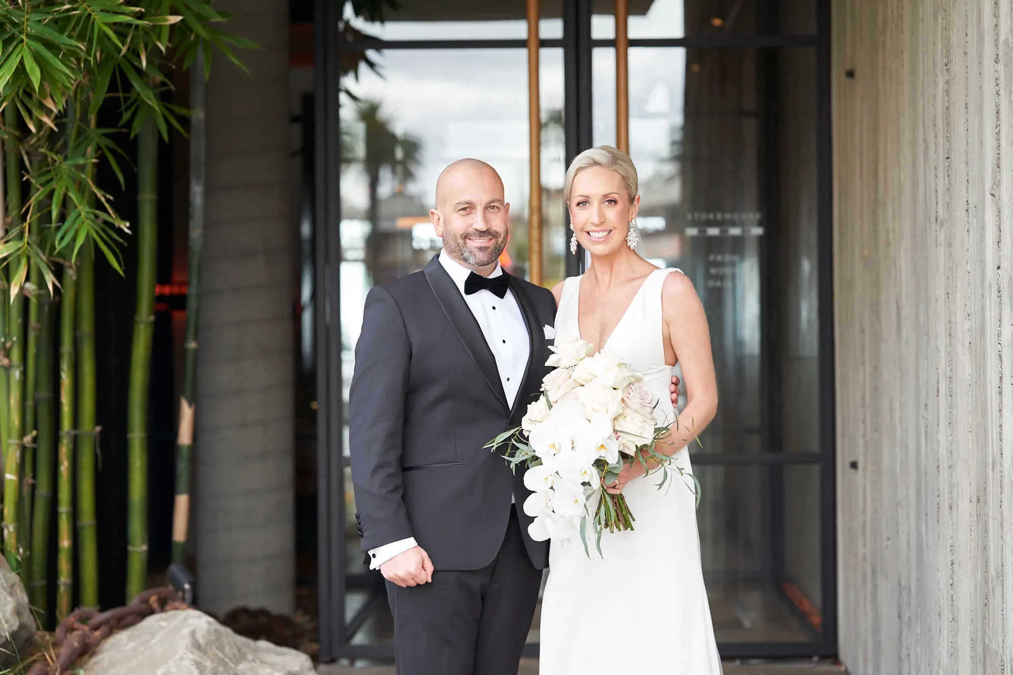 Adrian and Laura’s bride and groom portraits at Stokehouse St Kilda were defined by simplicity, calm, and modern elegance. Standing in front of the glass façade and bamboo-lined architecture, they created a striking yet understated image — Laura smiling gently while holding her bouquet, Adrian standing confidently beside her. The clean architectural lines paired with lush greenery offered a refined, contemporary backdrop that felt both luxurious and timeless. As they walked toward the camera, relaxed and smiling, the moments felt effortless and natural. These portraits embrace stillness and movement equally, capturing a sense of quiet celebration within a modern Melbourne setting.