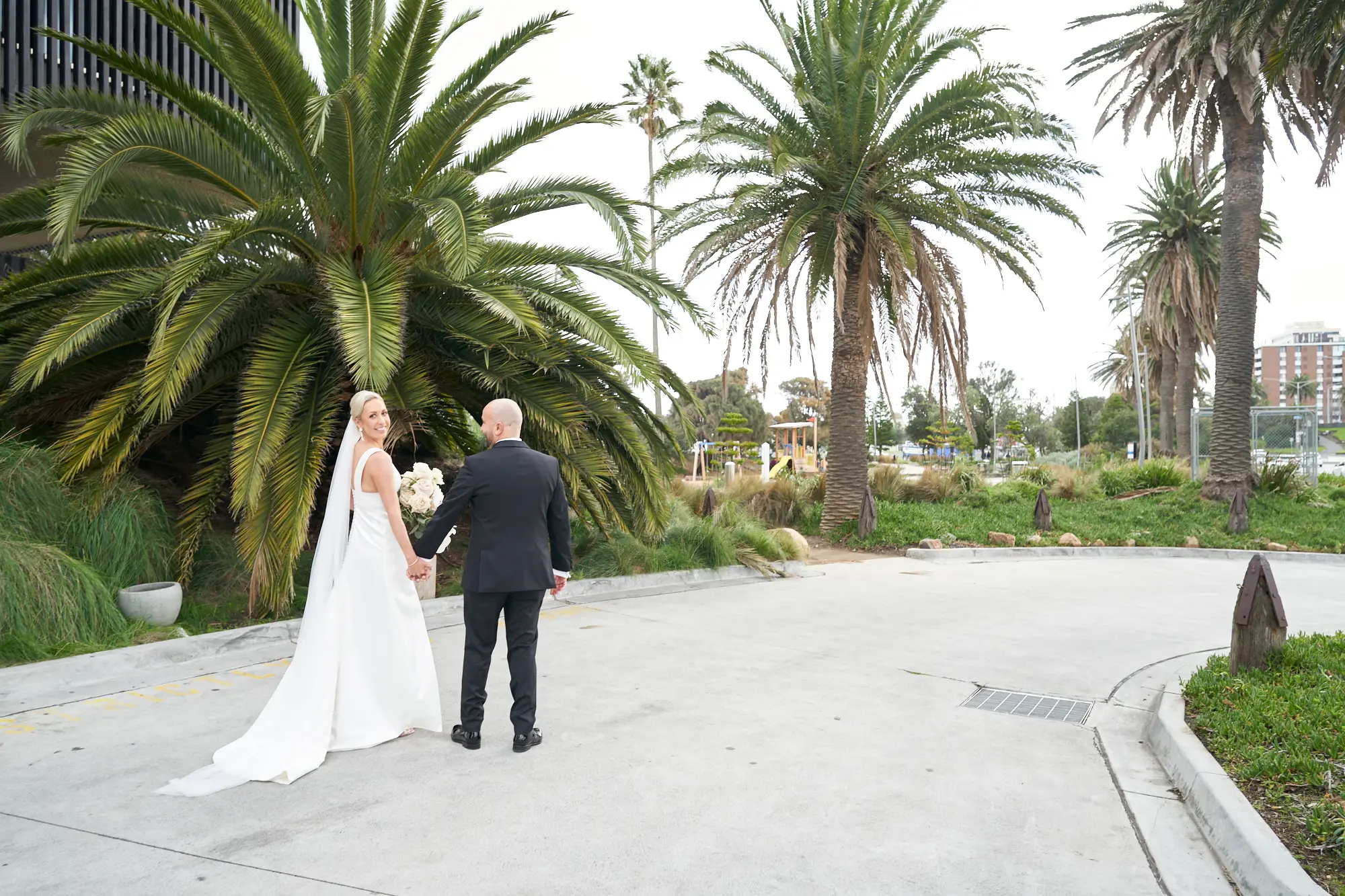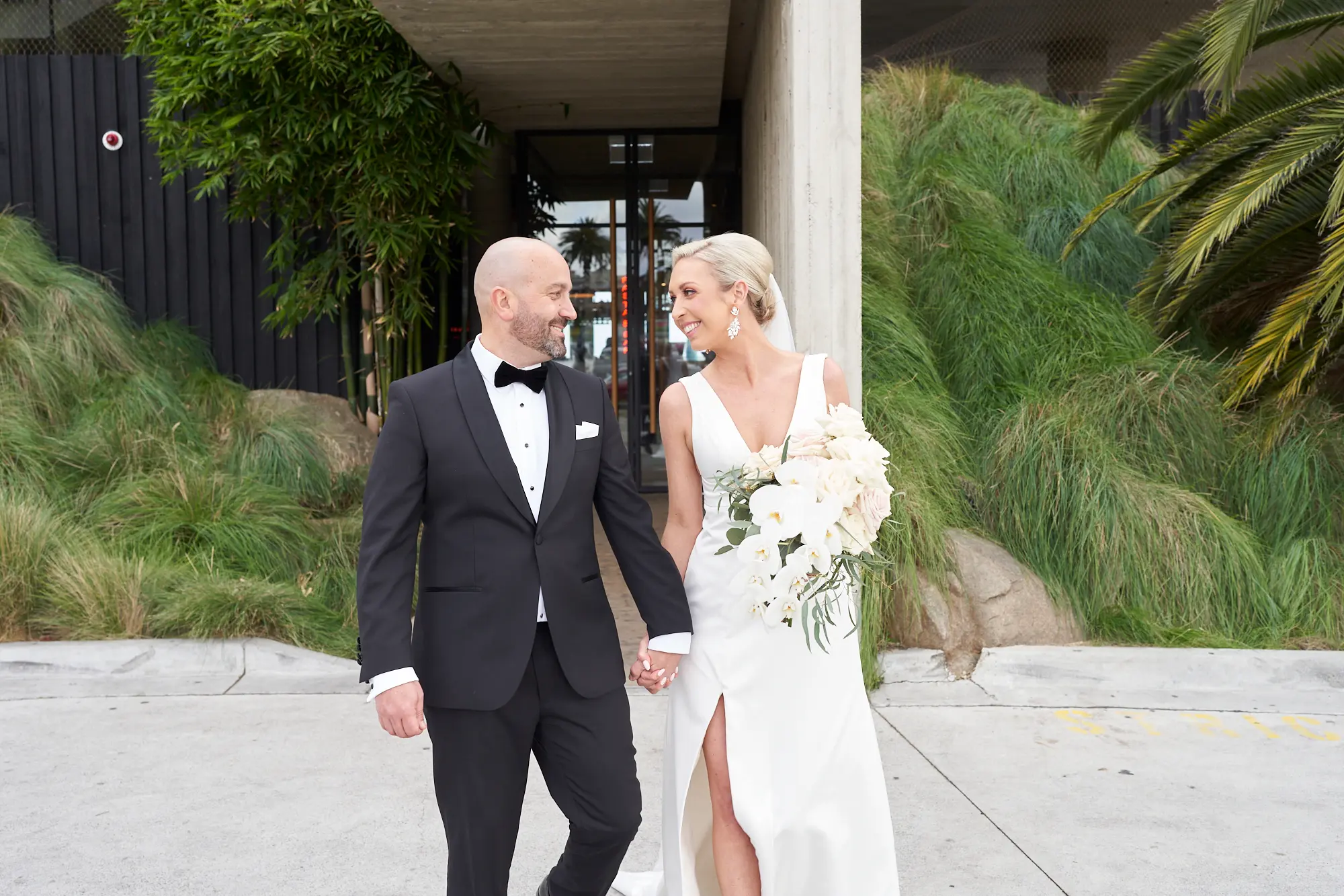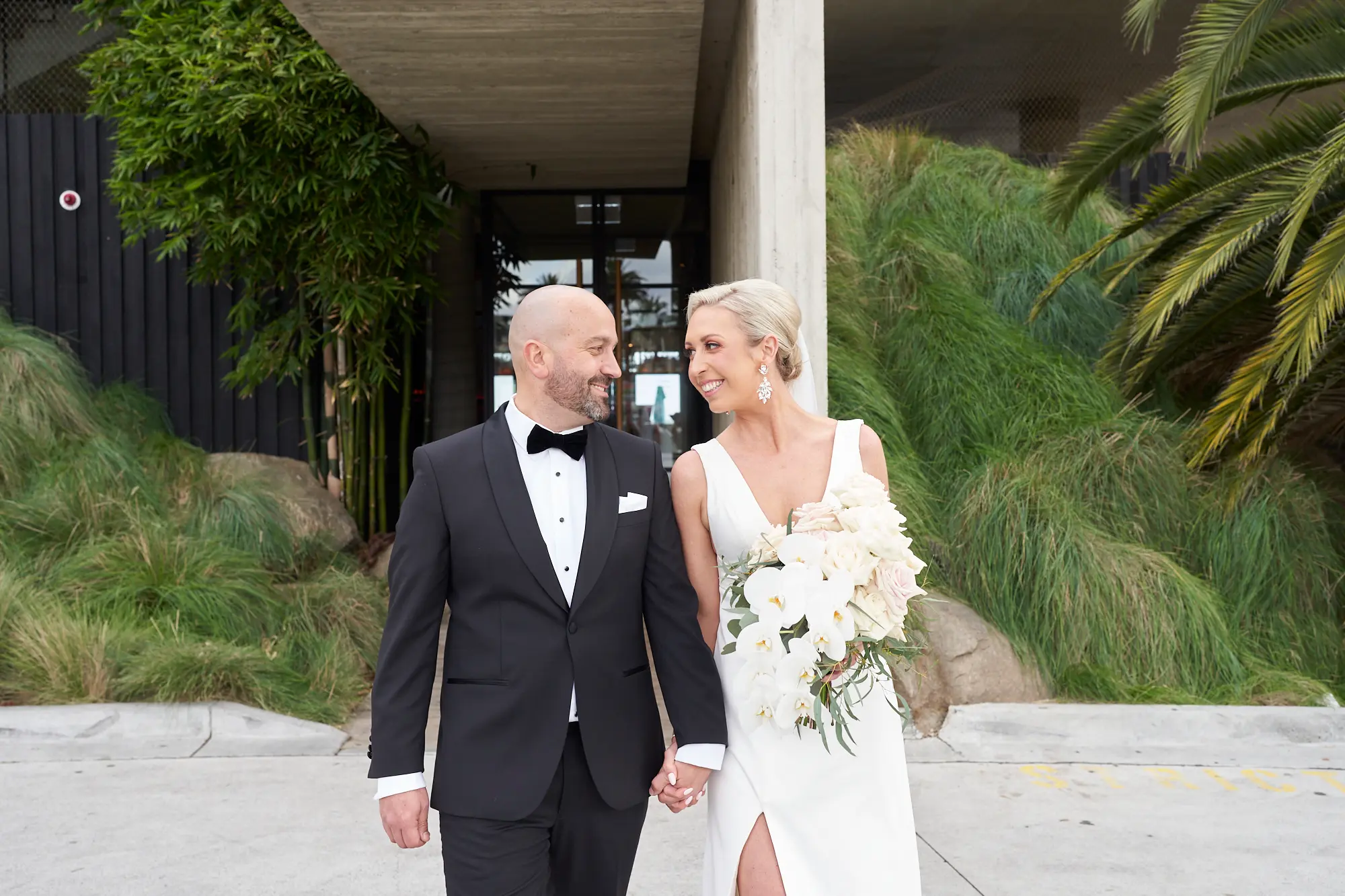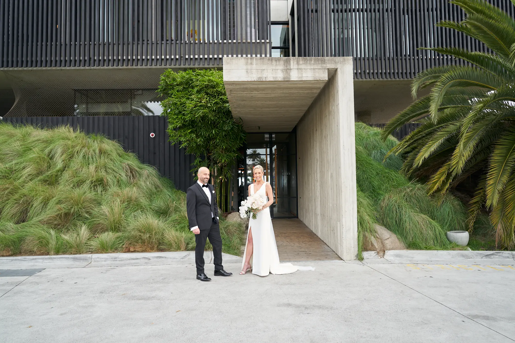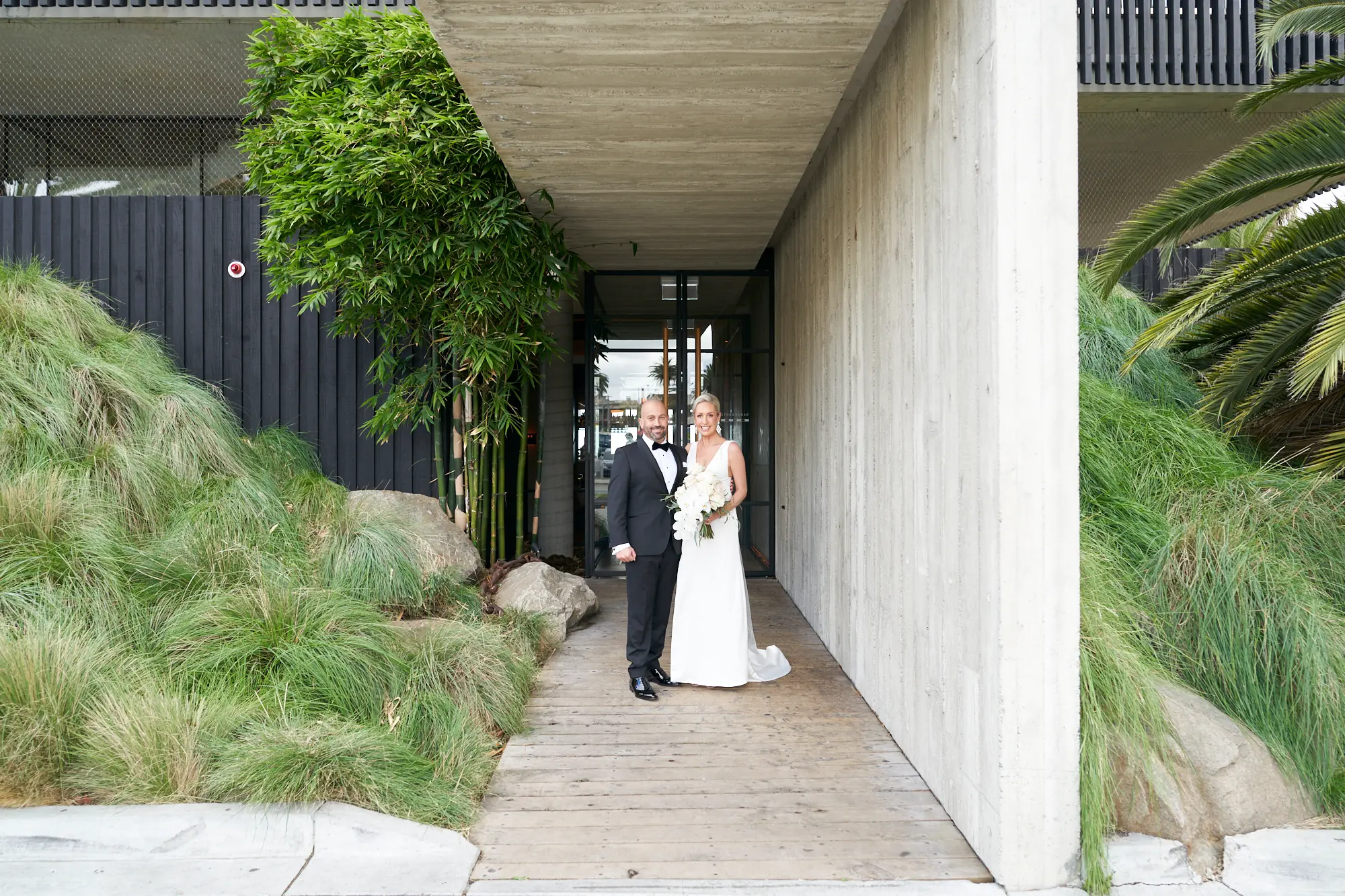 Adrian and Laura’s bride and groom portraits took place at Stokehouse St Kilda, where modern architecture and lush tropical foliage create a refined and cinematic backdrop.