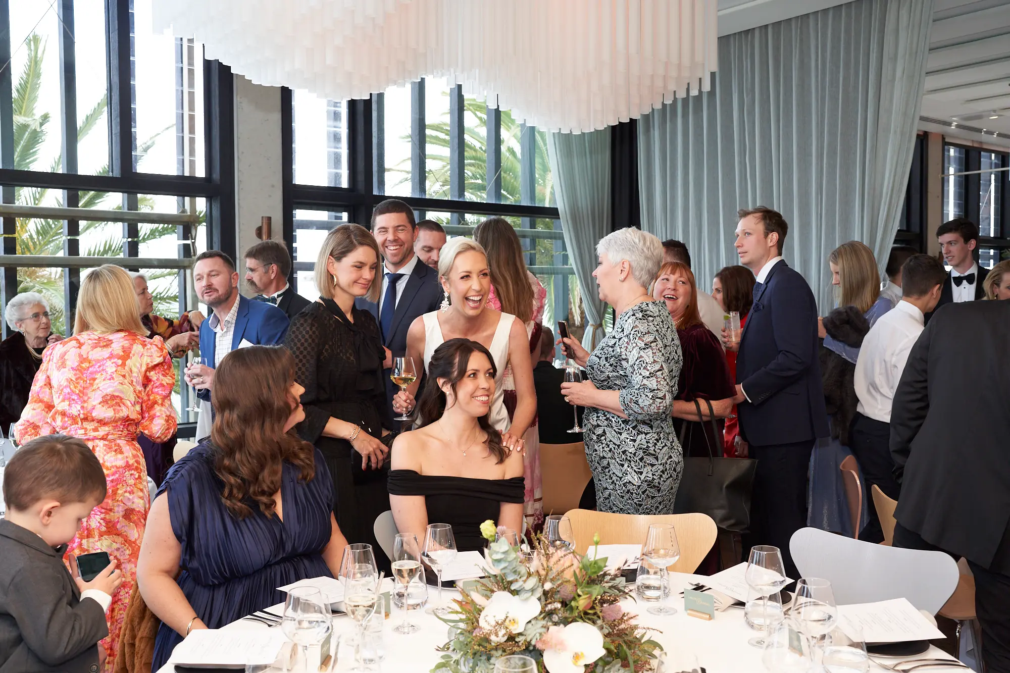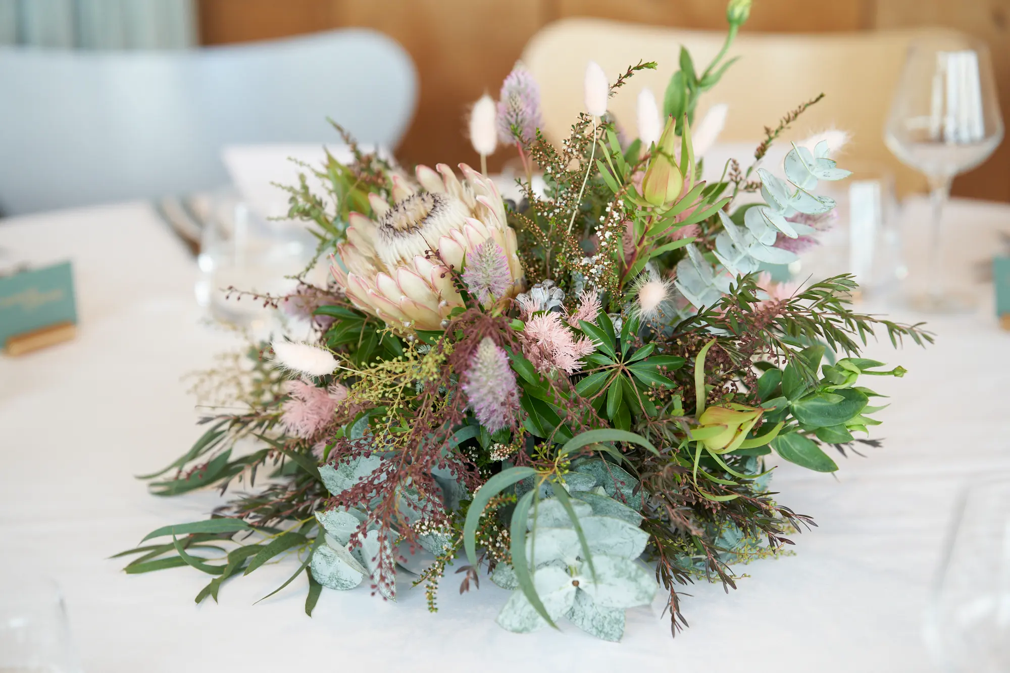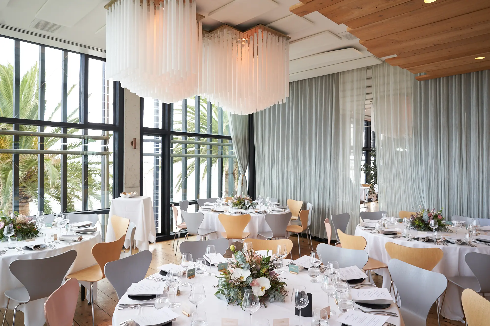 A beautifully styled reception space blending contemporary architecture, soft natural light, and lush native florals for a timeless seaside celebration.