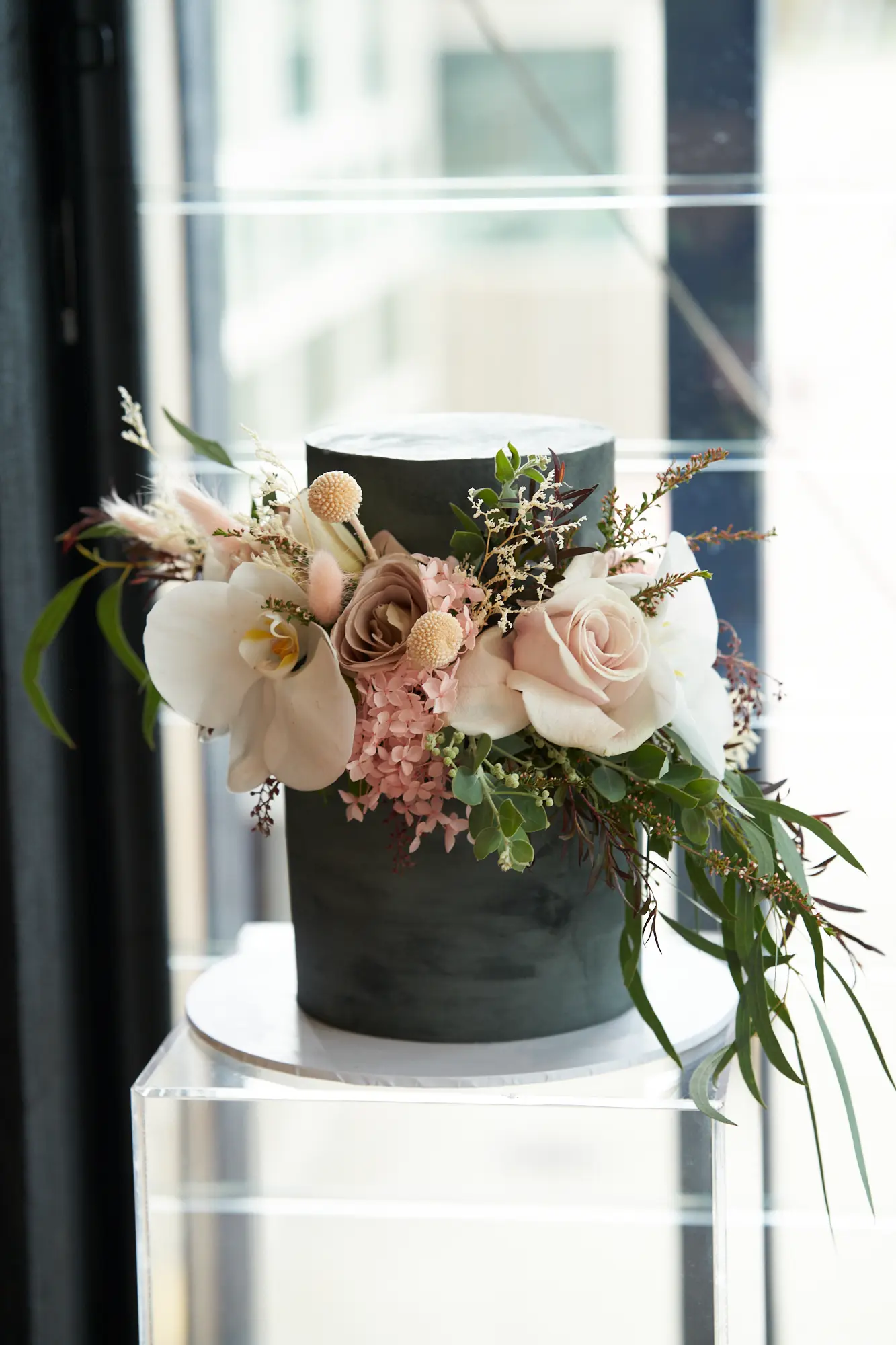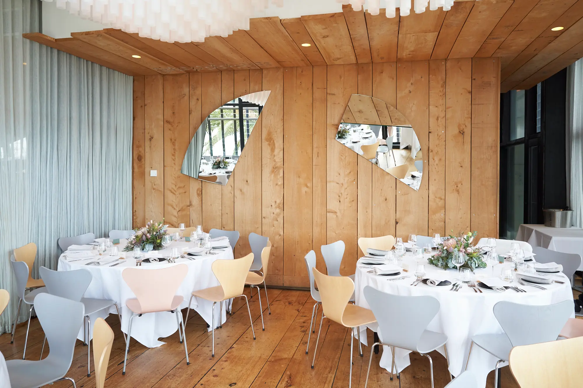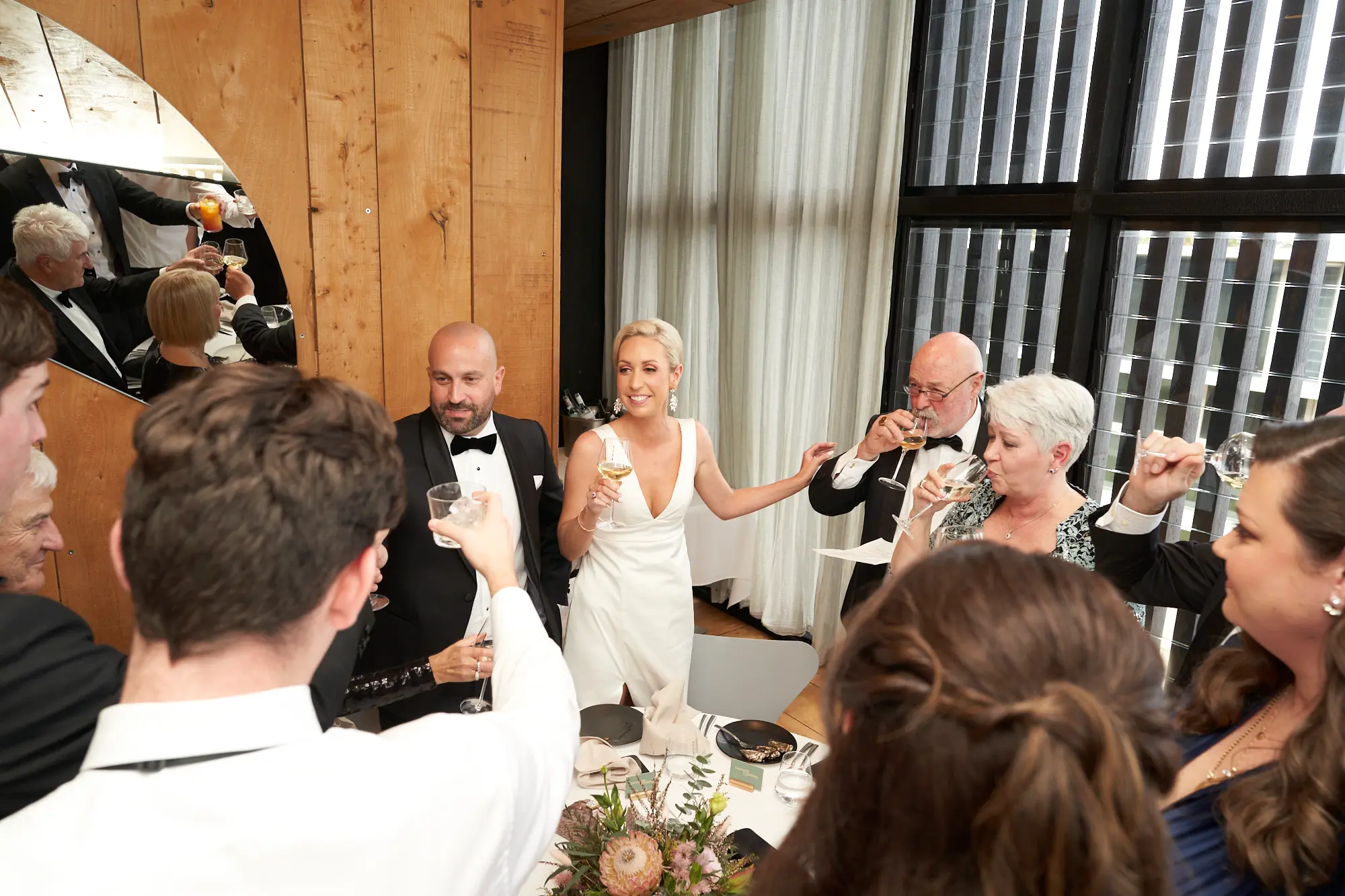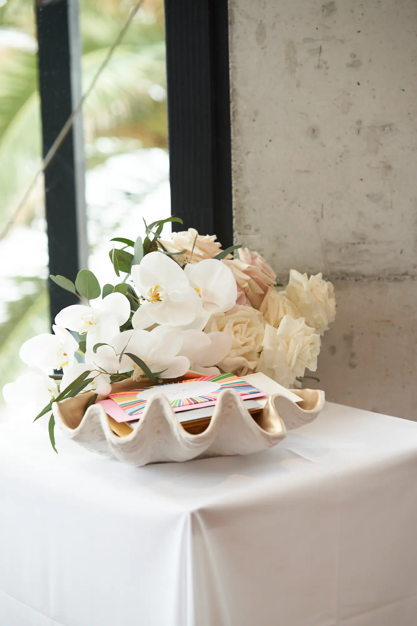A beautifully styled reception space blending contemporary architecture, soft natural light, and lush native florals for a timeless seaside celebration.
