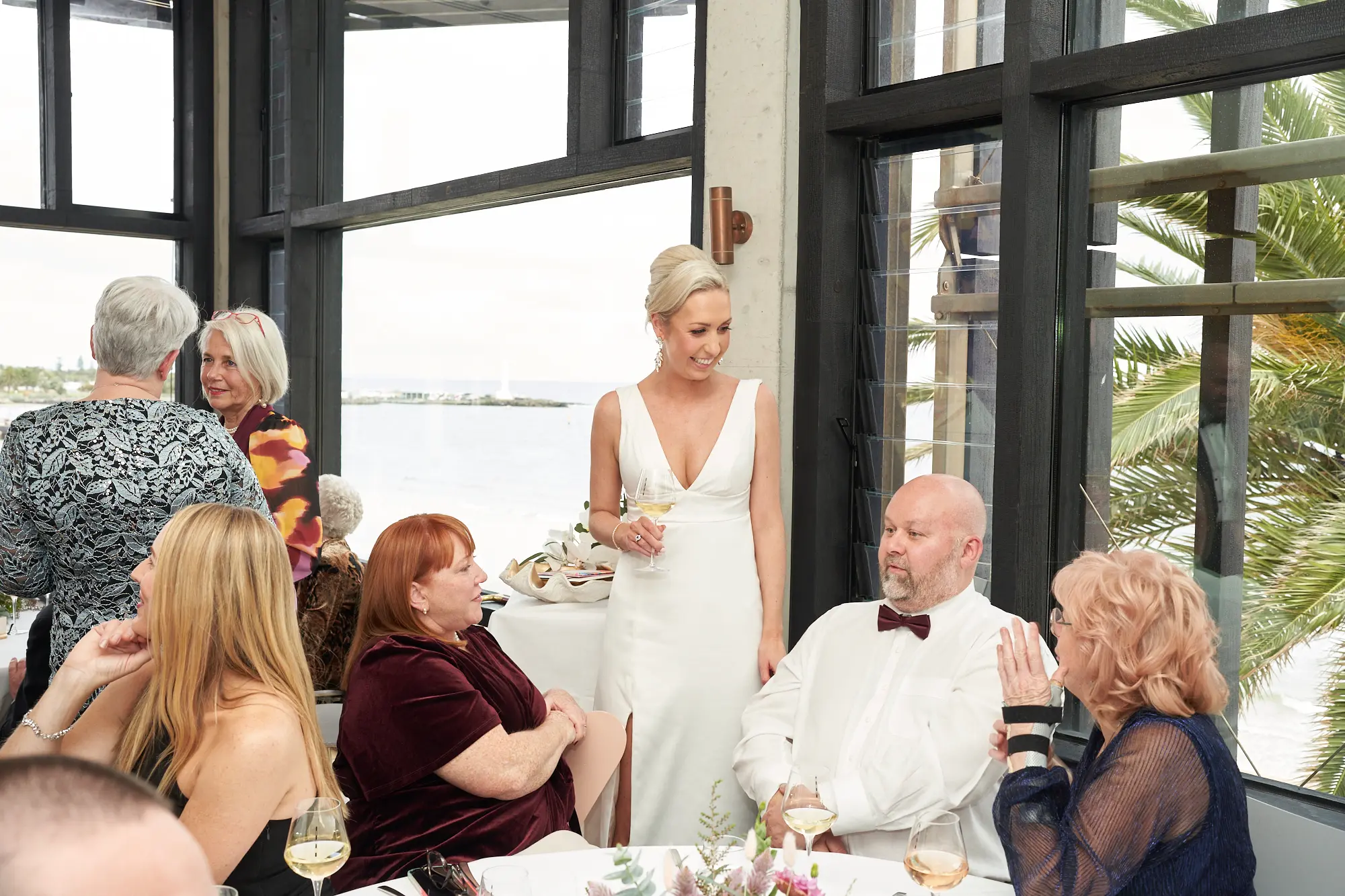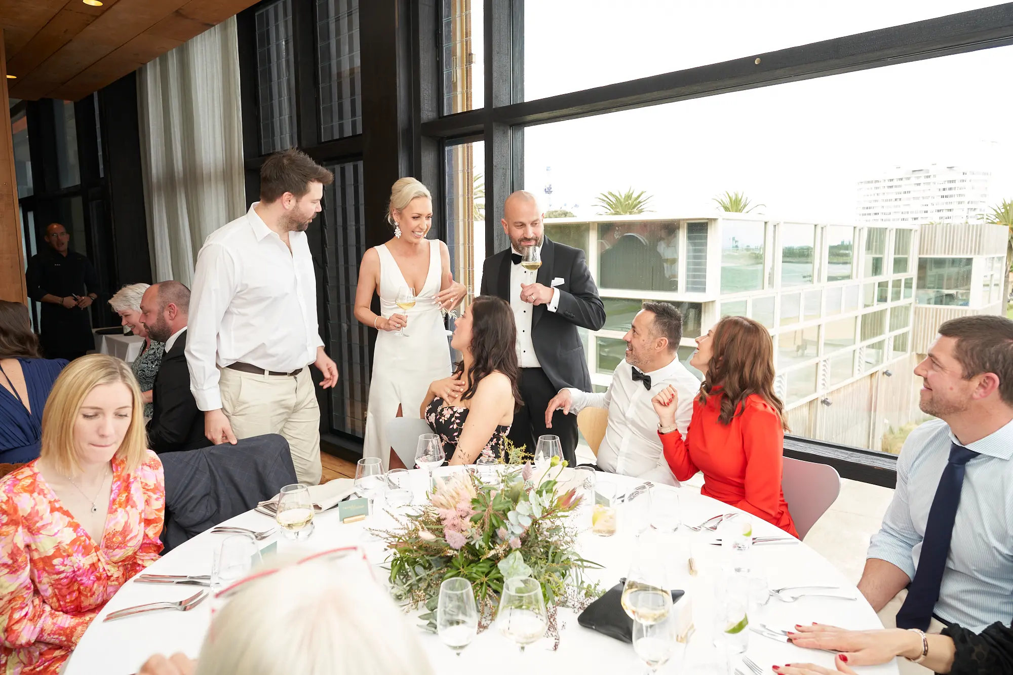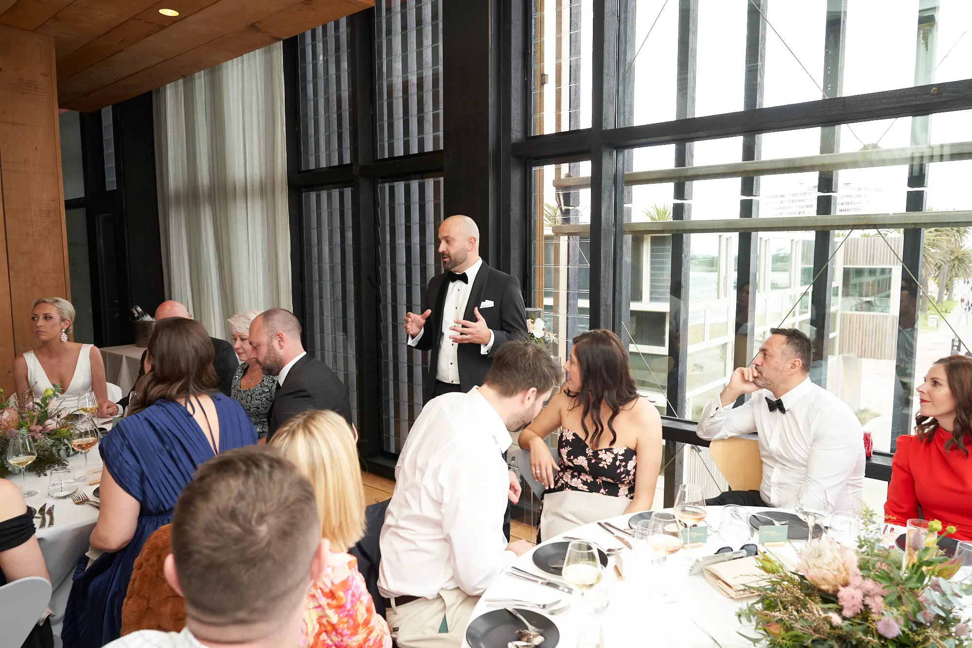 Framed by floor-to-ceiling windows and panoramic views over Port Phillip Bay, the atmosphere felt relaxed yet refined. Lush floral centrepieces featuring native blooms, eucalyptus foliage, and soft candlelight added warmth and texture to the space.