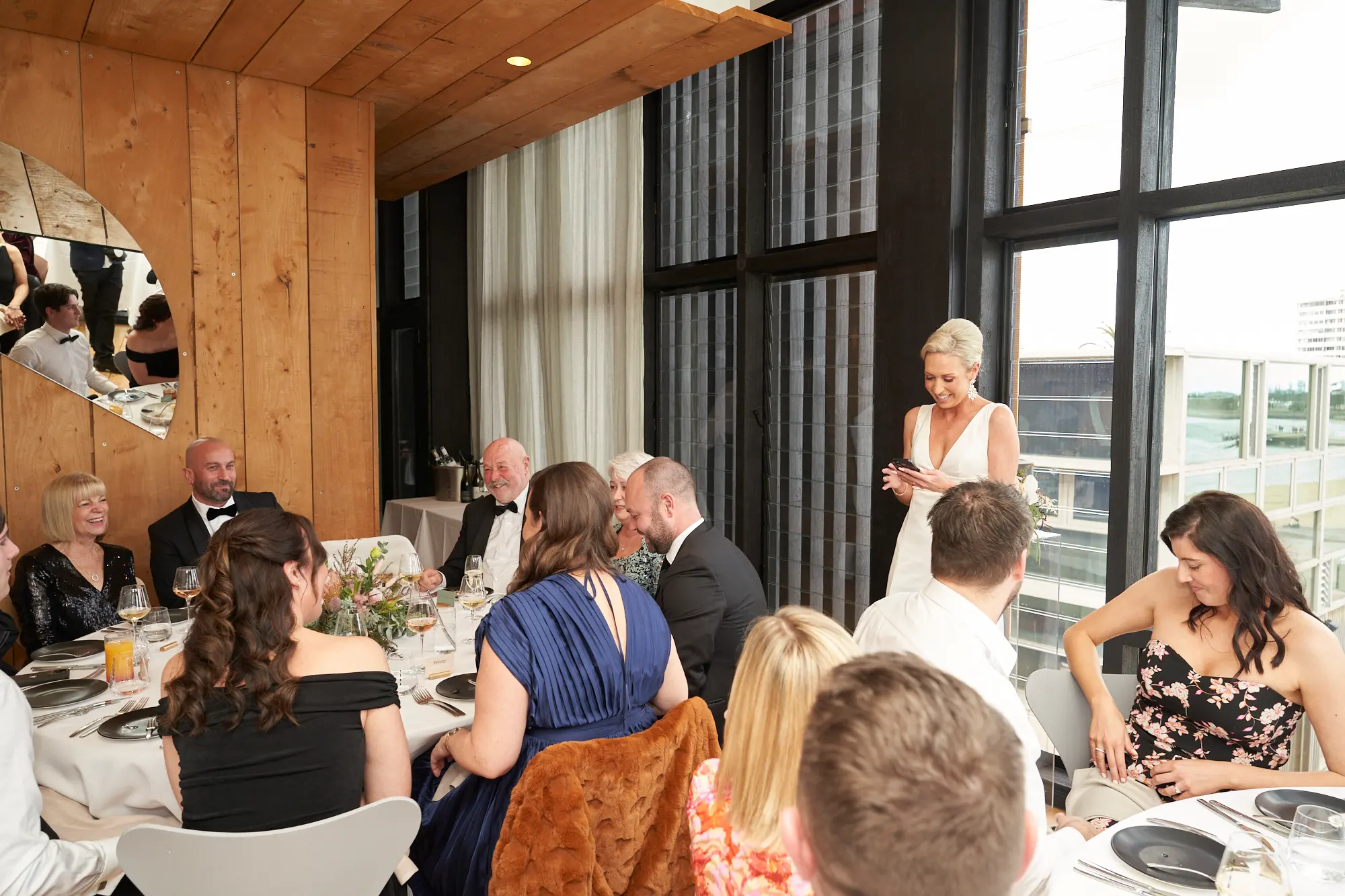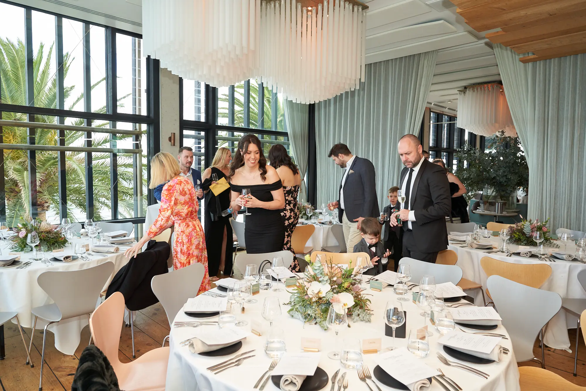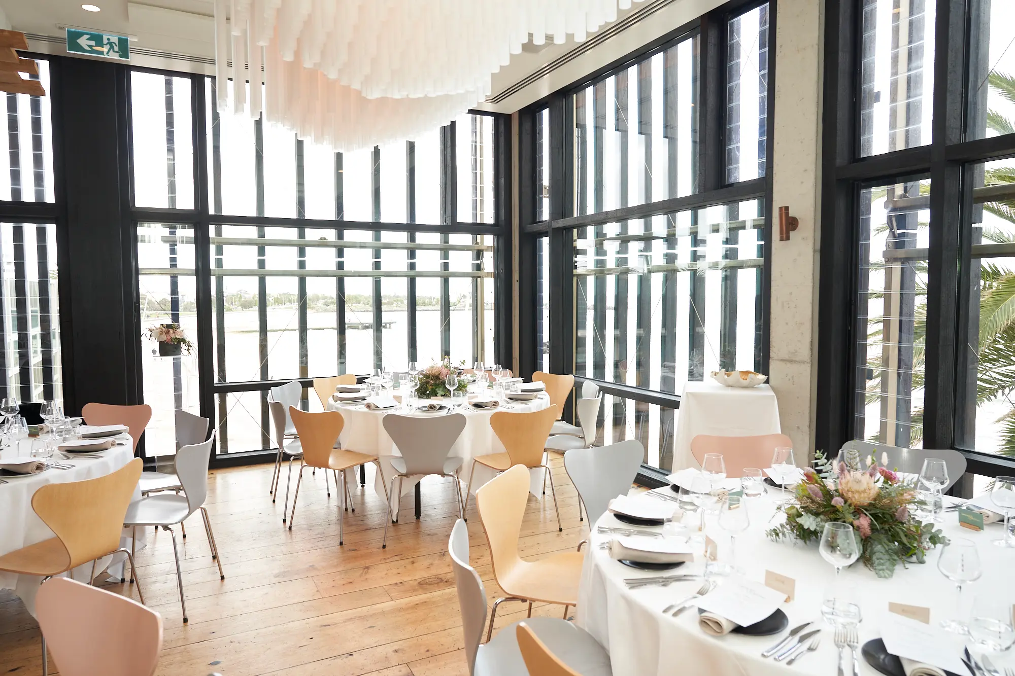 Framed by floor-to-ceiling windows and panoramic views over Port Phillip Bay, the atmosphere felt relaxed yet refined. Lush floral centrepieces featuring native blooms, eucalyptus foliage, and soft candlelight added warmth and texture to the space.
