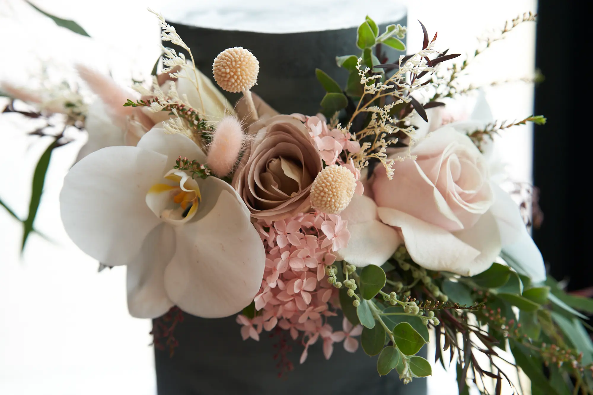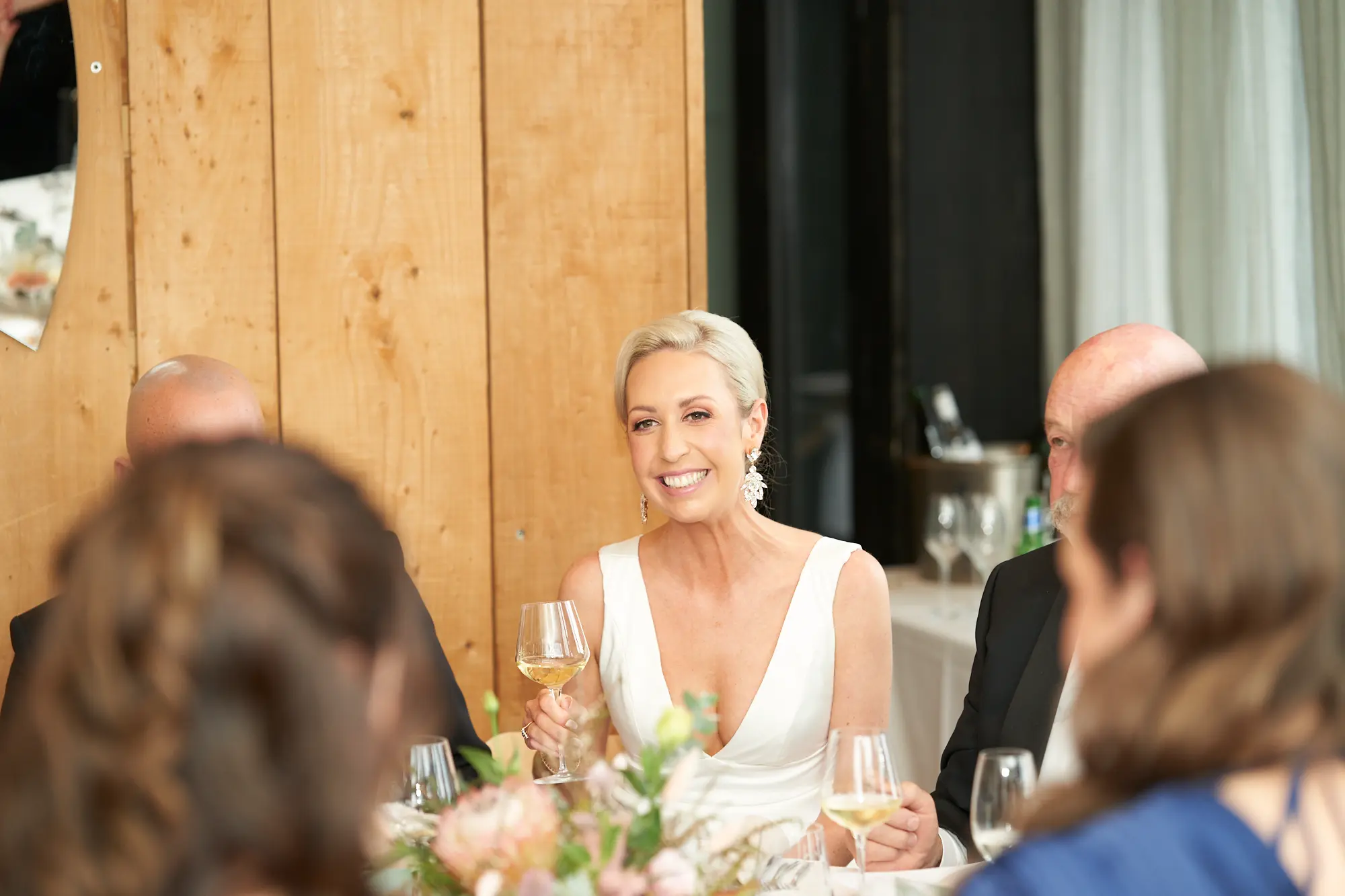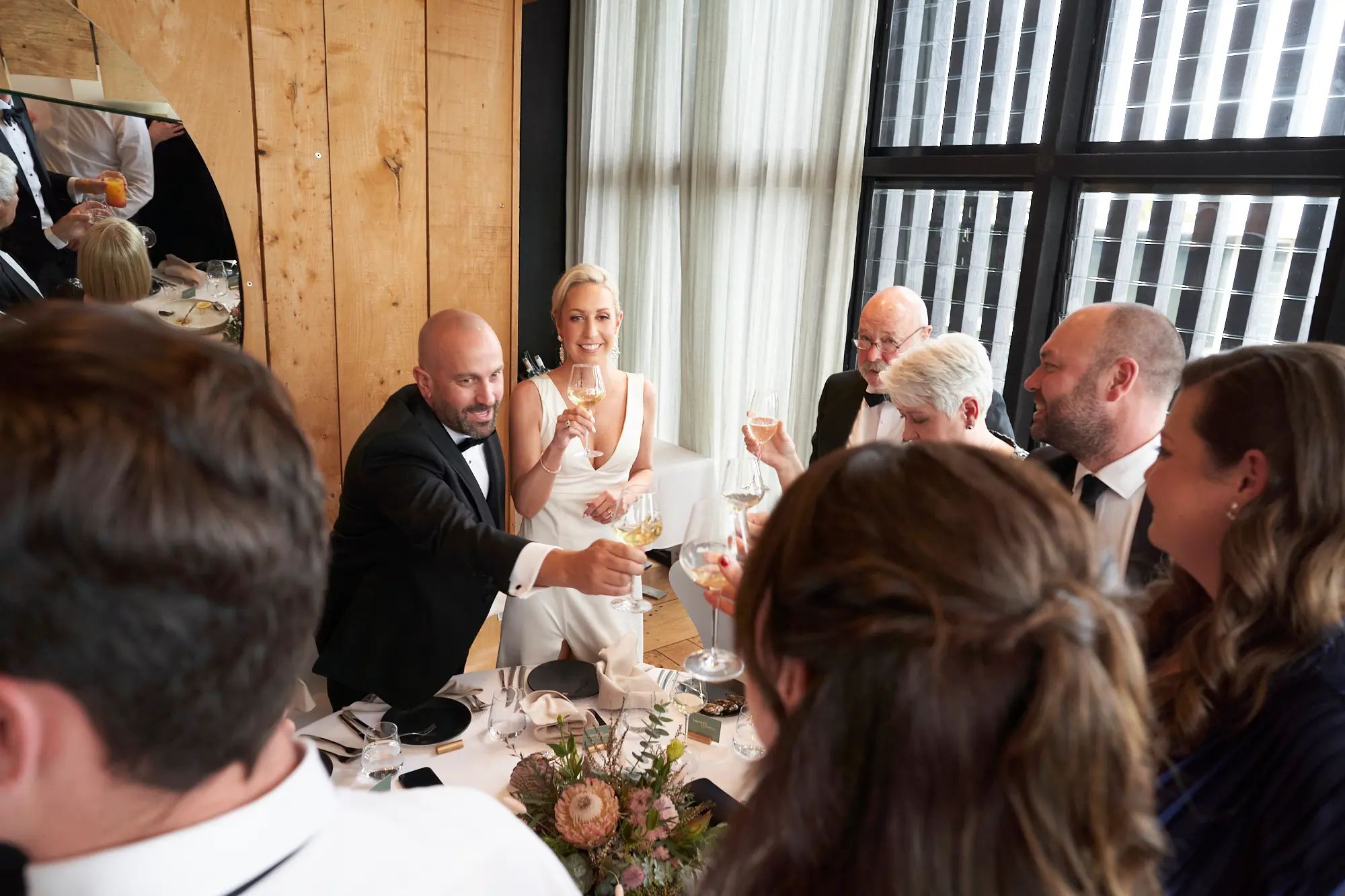 Every detail of Adrian and Laura’s reception setup reflects modern coastal sophistication. The airy interiors of Stokehouse St Kilda, softened by sheer curtains and blonde timber finishes, create a sense of warmth and openness. Natural light highlights the carefully curated table settings, where native florals and candlelight add organic texture without overwhelming the space. The floral styling — rich with protea, eucalyptus, and soft pastel accents — brings a sense of timeless luxury. Even the wedding cake becomes a design statement, combining minimalist form with sculptural floral details. Together, these elements create an atmosphere that feels elegant, intentional, and effortlessly beautiful.