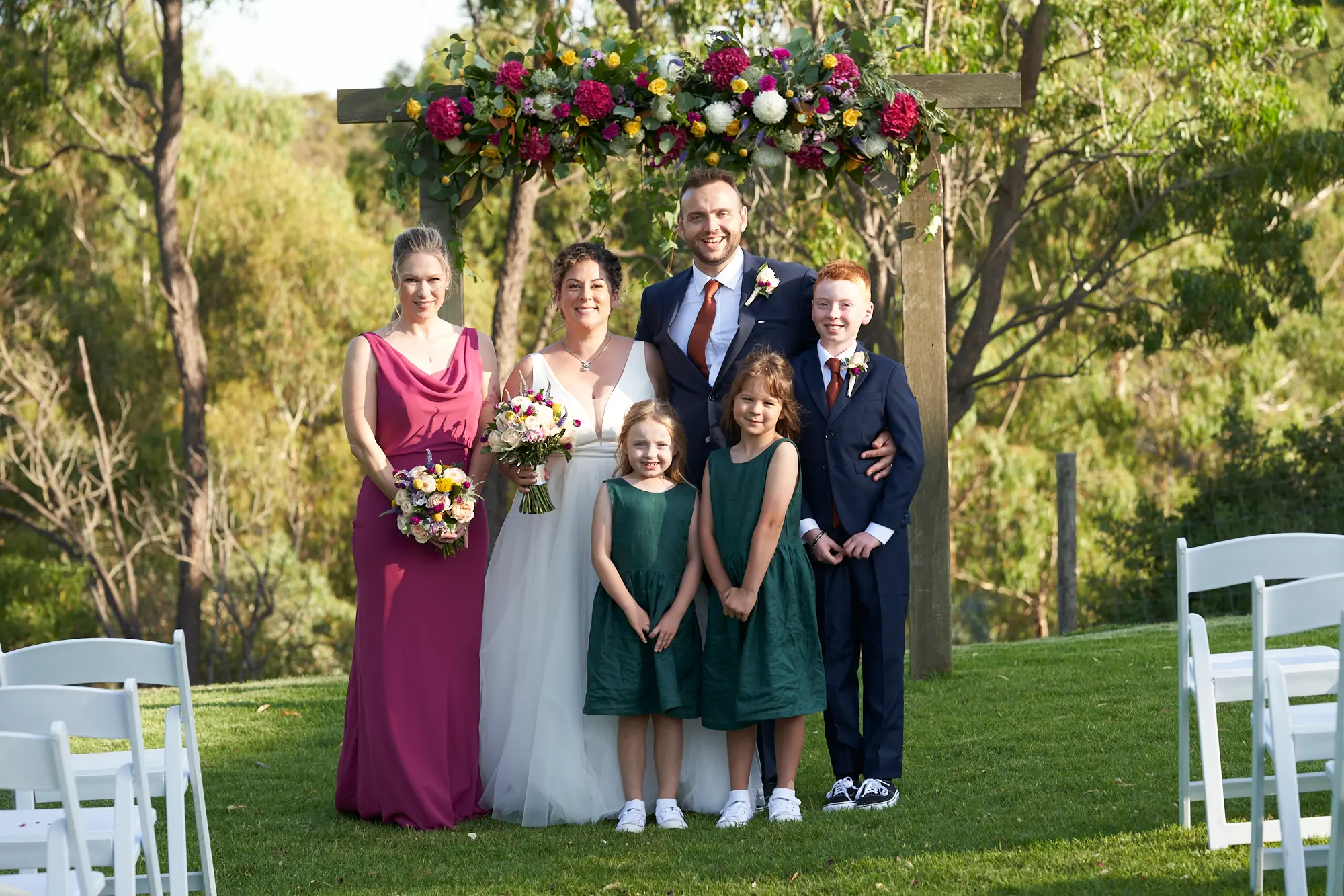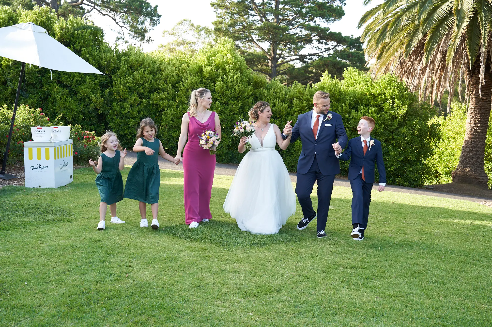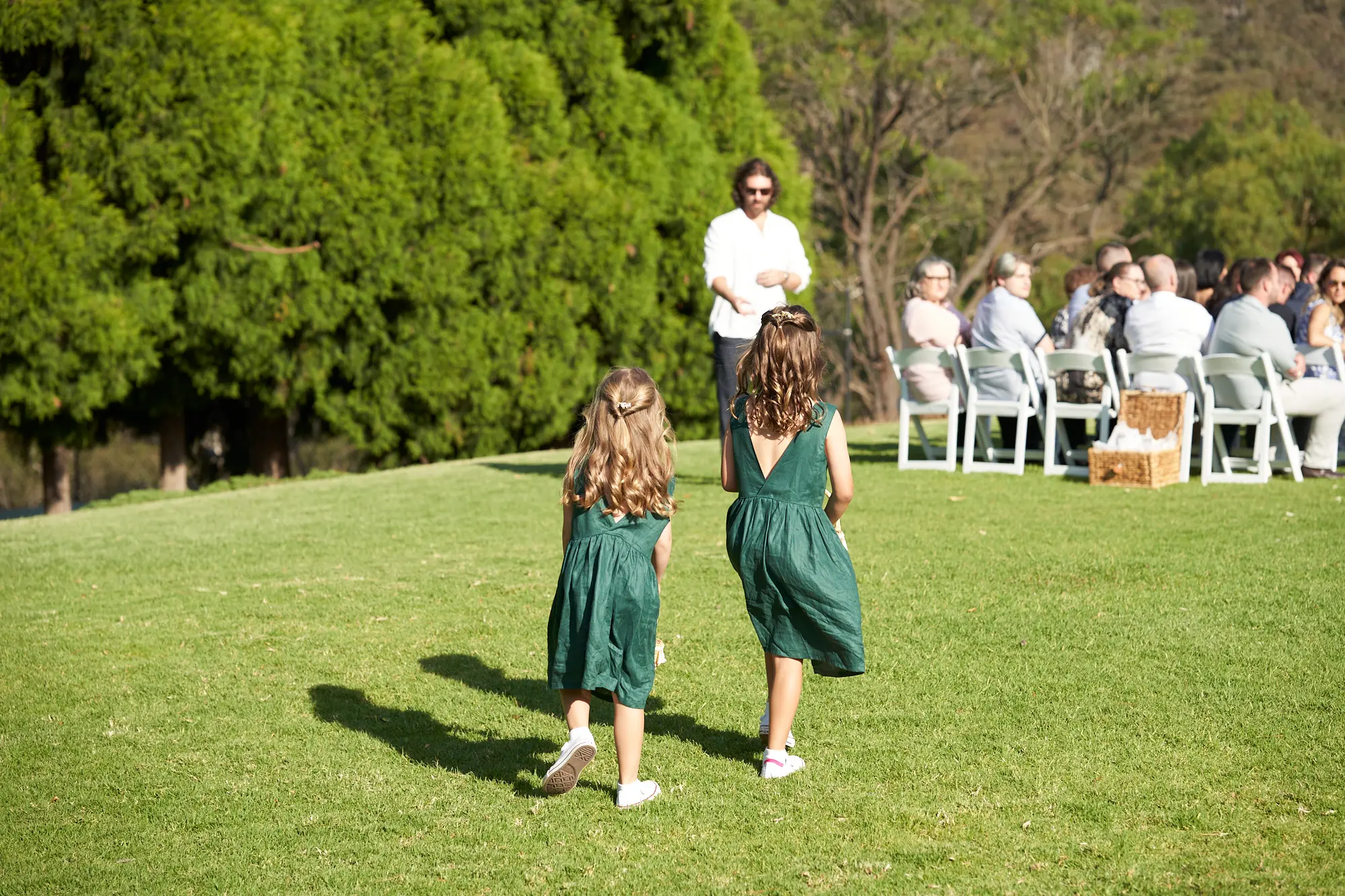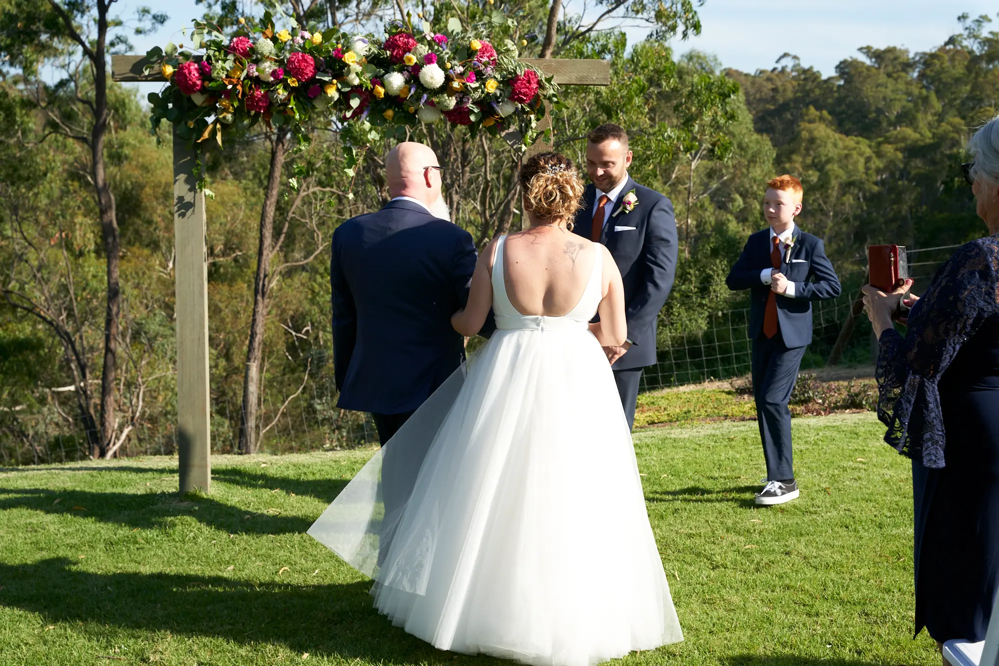 On a warm, sunny day in South Morang, Christian waited at the end of the aisle as guests settled in and anticipation built. Two sweet flower girls made their way down the steps to the lawn, followed by Allison arriving with her father — a moment I captured with wide-angle images that showcased the stunning setting.