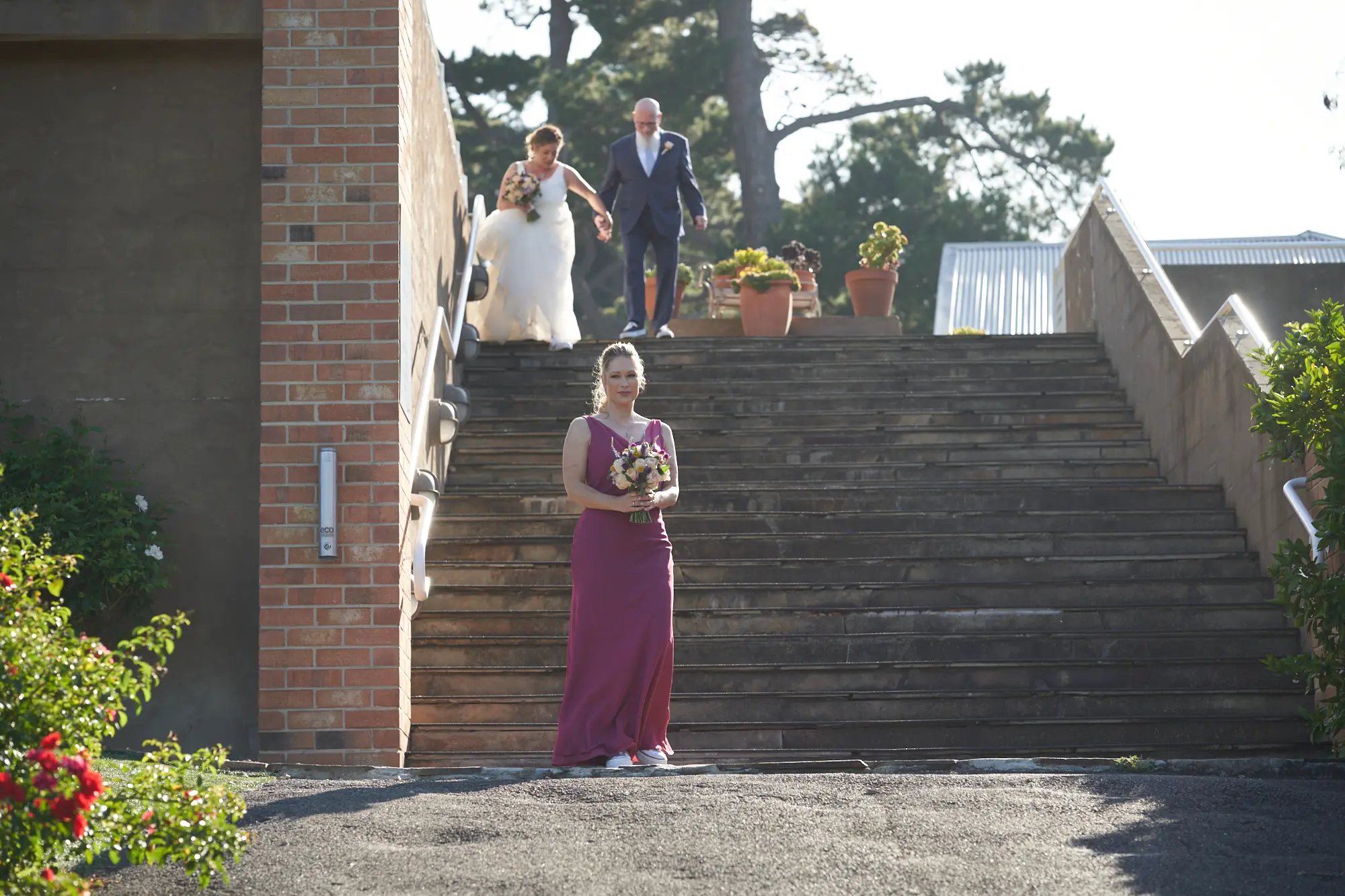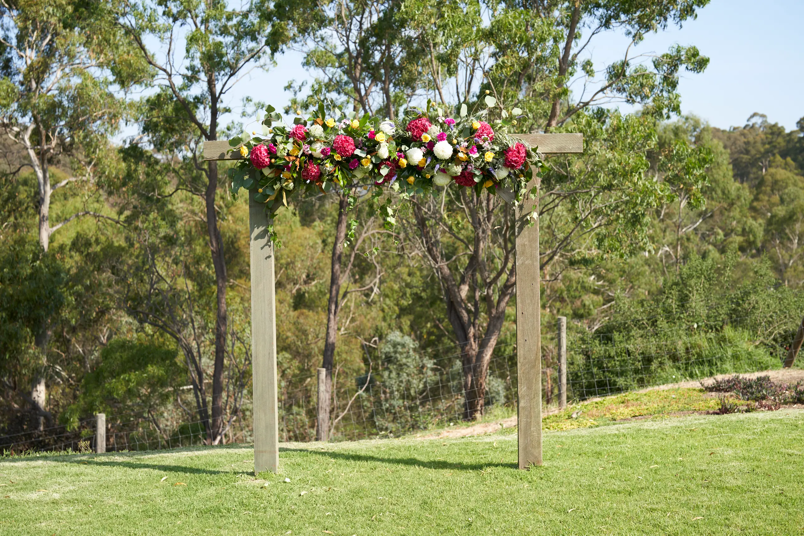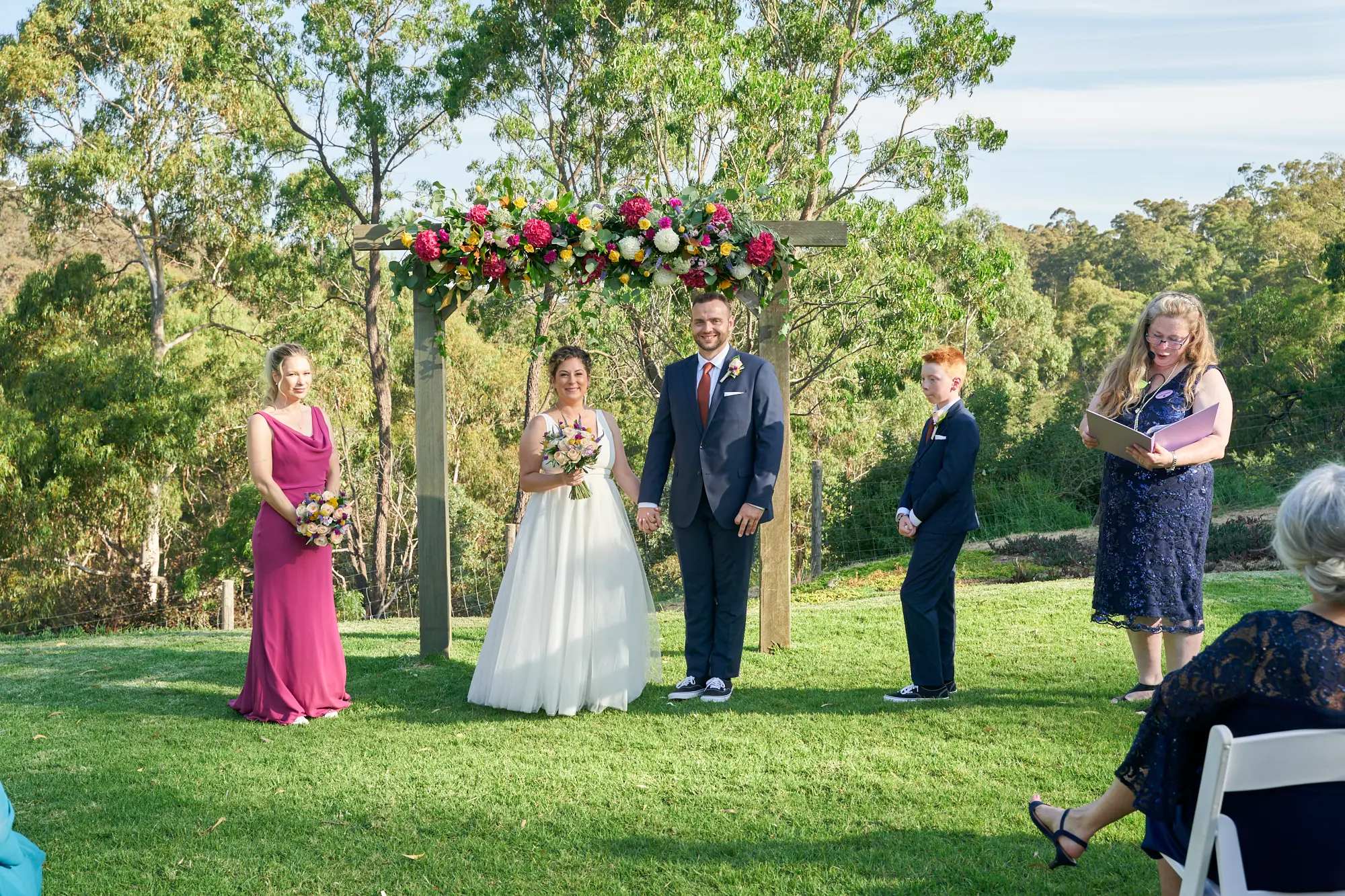 On a warm, sunny day in South Morang, Christian waited at the end of the aisle as guests settled in and anticipation built. Two sweet flower girls made their way down the steps to the lawn, followed by Allison arriving with her father — a moment I captured with wide-angle images that showcased the stunning setting.