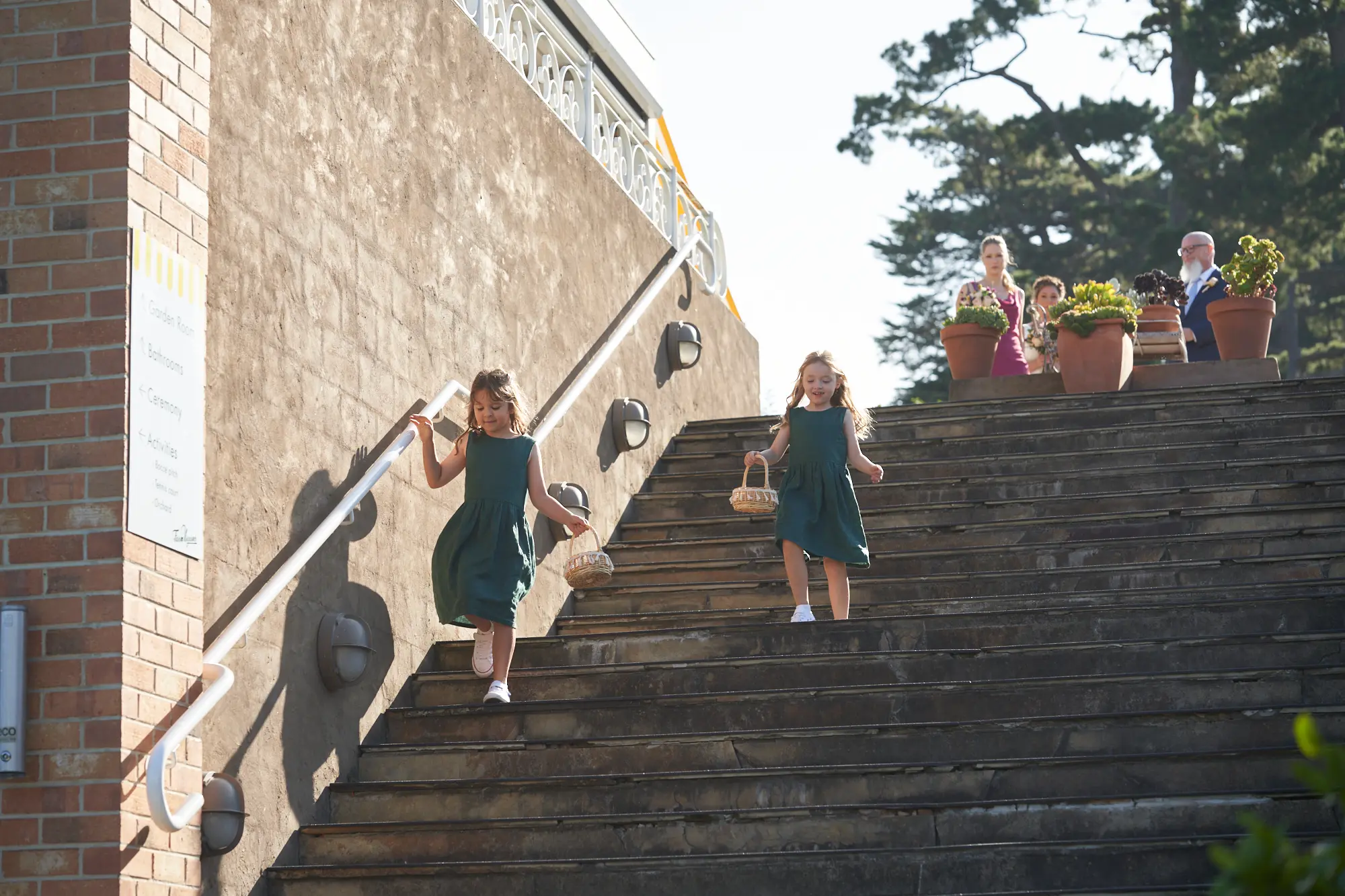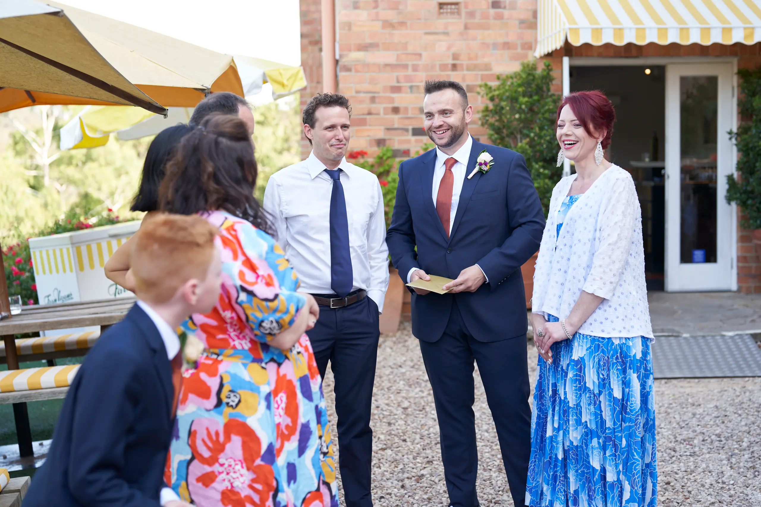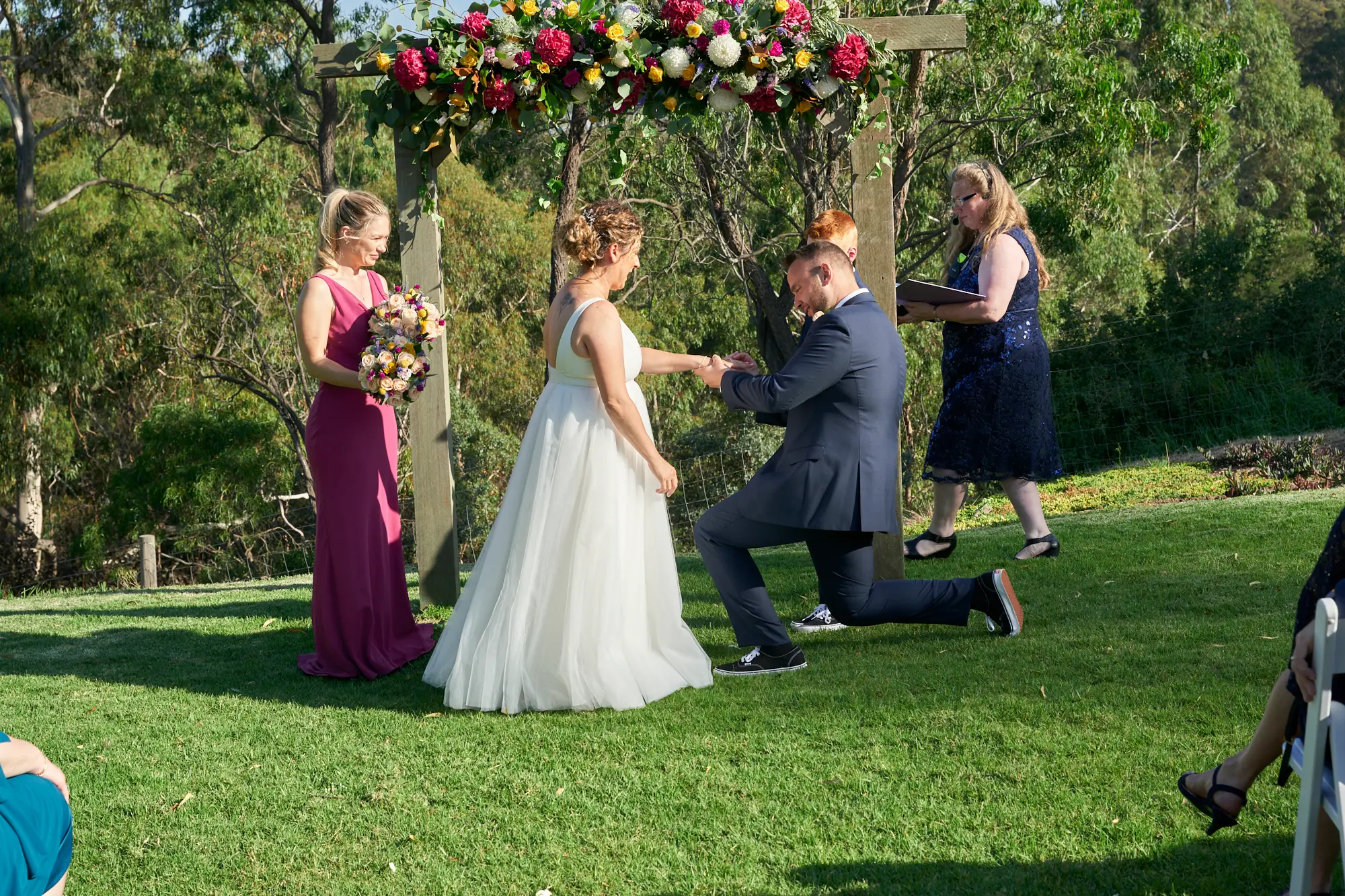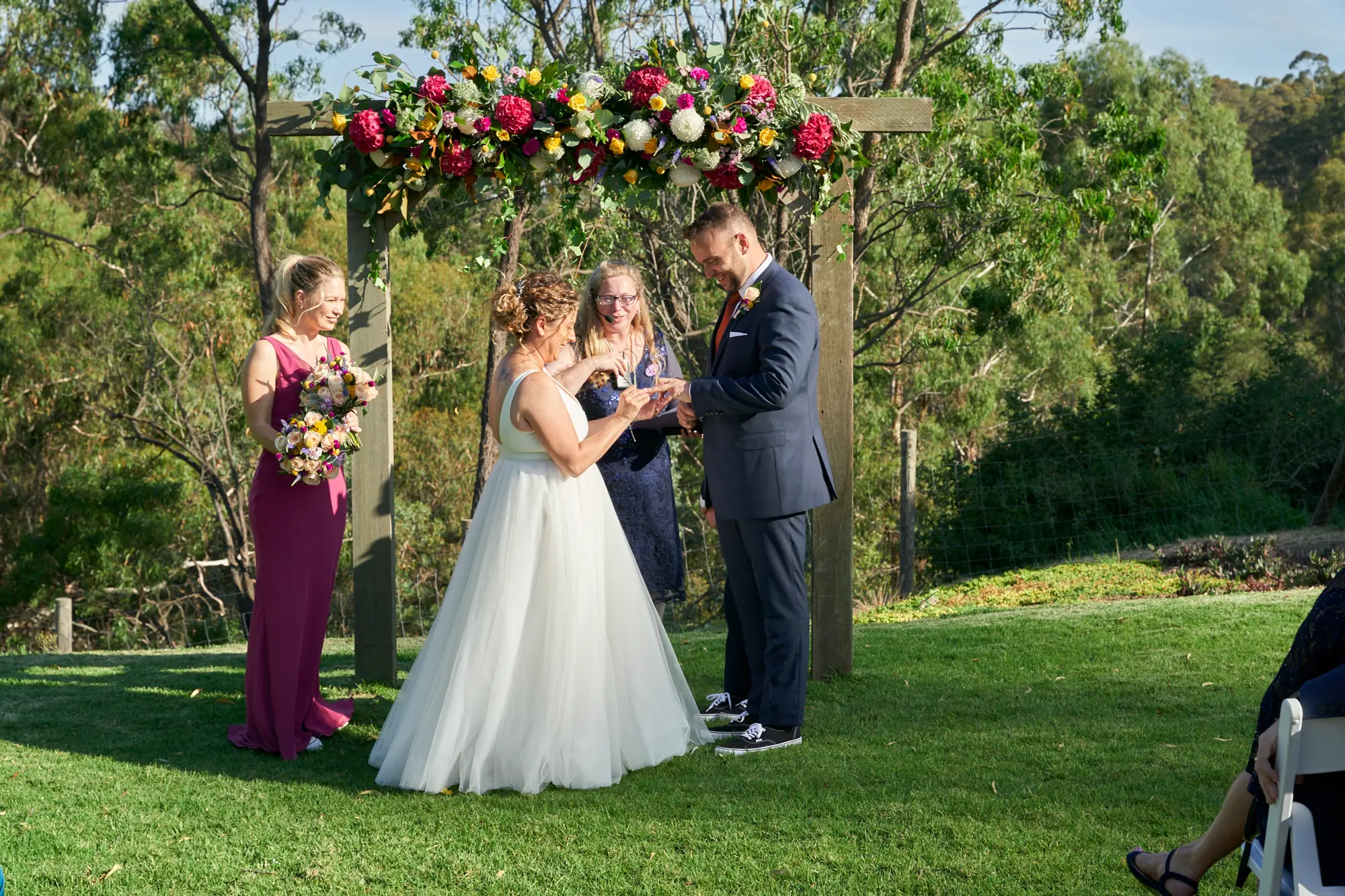 On a warm, sunny day in South Morang, Christian waited at the end of the aisle as guests settled in and anticipation built. Two sweet flower girls made their way down the steps to the lawn, followed by Allison arriving with her father — a moment I captured with wide-angle images that showcased the stunning setting.