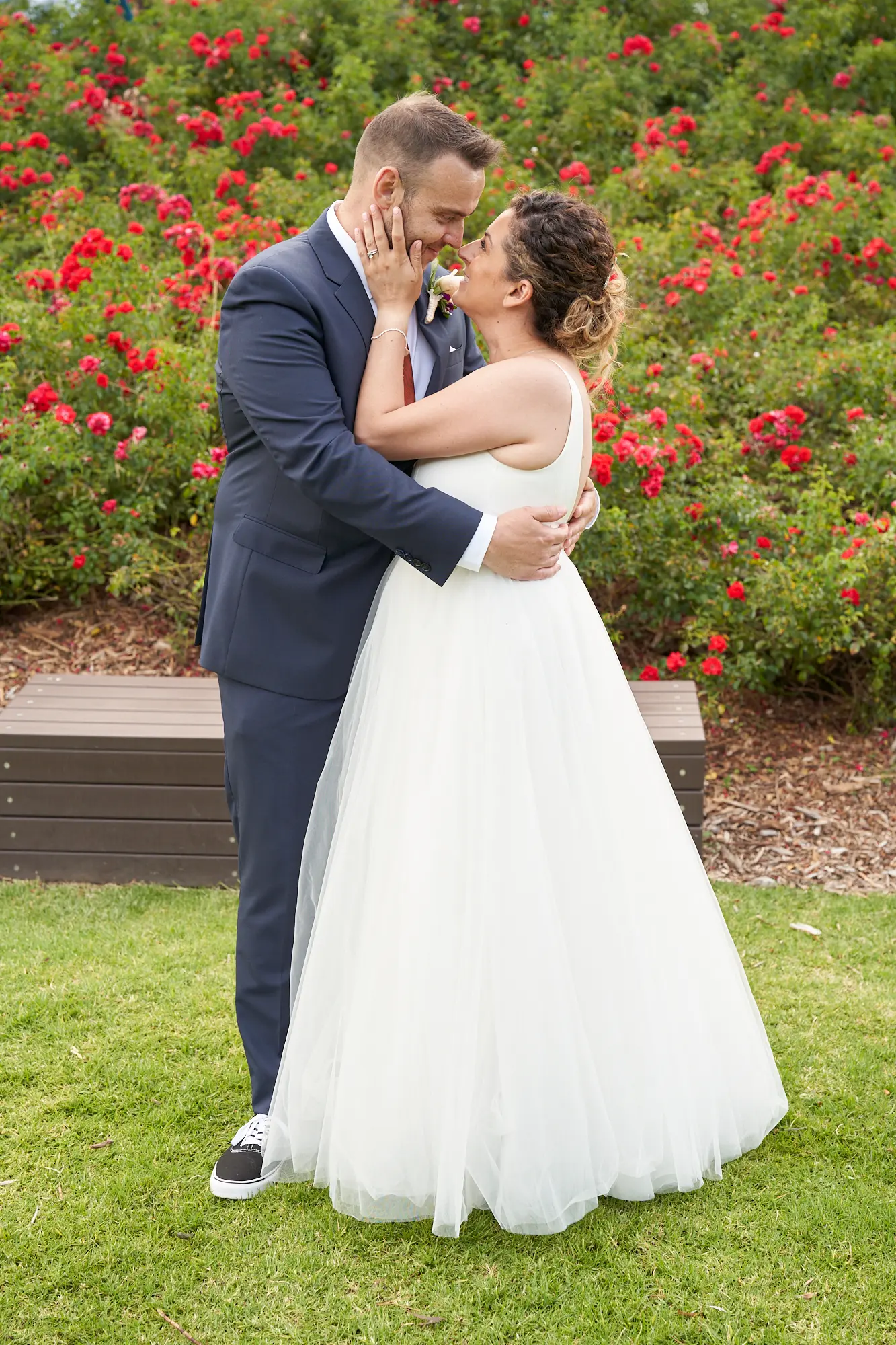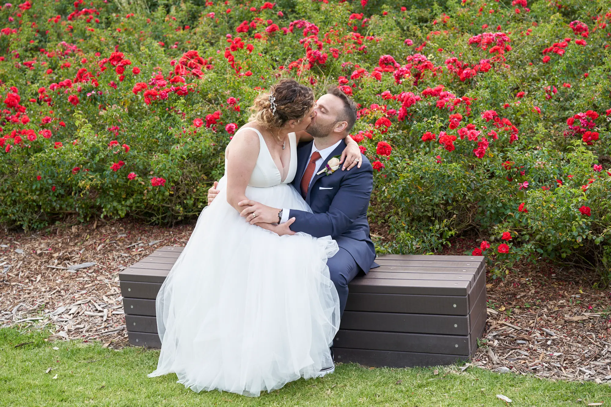 The second part of the couple portrait session focused on tighter, editorial-inspired compositions that highlight intimacy and connection. Using portrait lenses and shallow depth of field, I photographed Allison and Christian holding hands and sharing quiet kisses beneath the wedding arch, framed by soft greenery. One standout moment captured them kissing with the rose garden gently blurred behind, creating a refined, fashion-inspired look. By narrowing the focus, these images draw attention to emotion, touch, and expression while still retaining a sense of place. This approach creates elegant, timeless portraits that feel both modern and classic, designed to remain visually beautiful for years to come.