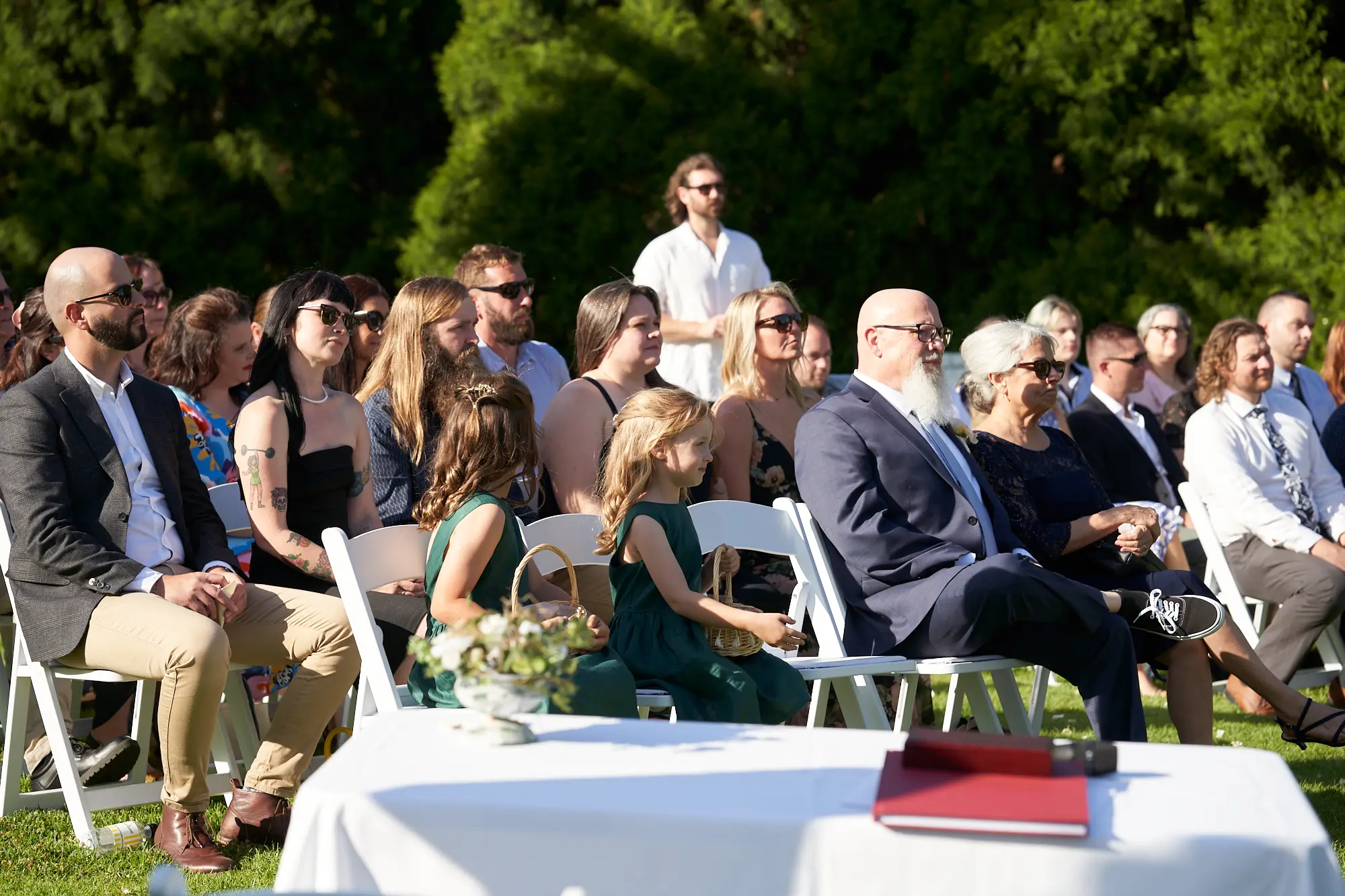 The pre-ceremony moments at Farm Vigano unfolded slowly and beautifully, filled with quiet anticipation and thoughtful details. I documented the ceremony setup as it came together — the wedding arch framed by gardens, rows of chairs waiting under the open sky, and a rustic wicker basket filled with individual confetti cones. As guests began to arrive, Christian welcomed friends and family with warm smiles and relaxed conversations. Two sweet flower girls arrived early, and I captured a few lovely portraits of them among the rose gardens, adding a gentle, joyful energy to the morning. These moments set the tone for the heartfelt celebration to follow.