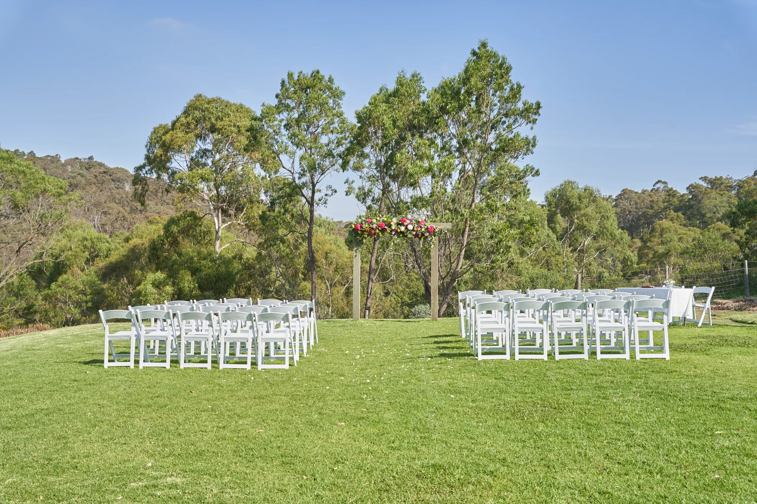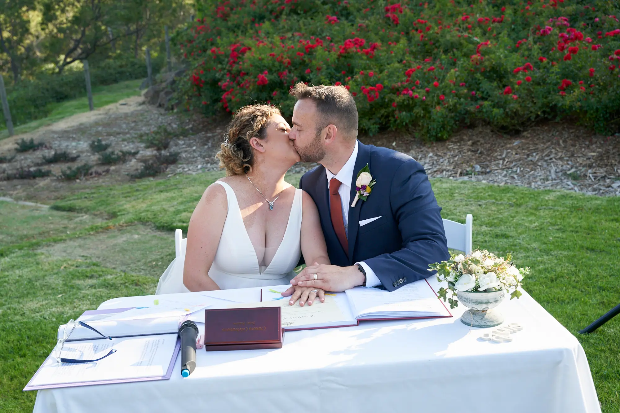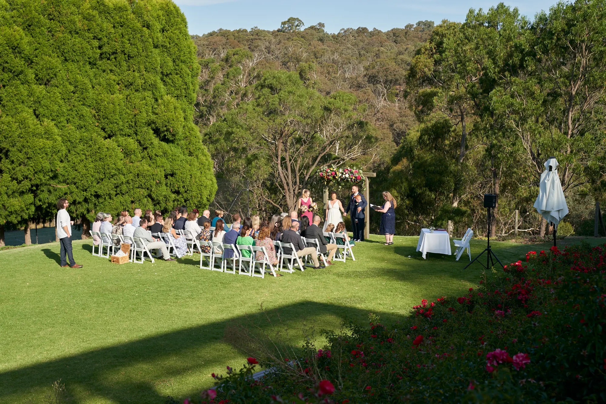 Allison and Christian’s wedding ceremony took place on a beautiful lawn at Farm Vigano, surrounded by rose gardens and sweeping views across the valley and trees beyond.