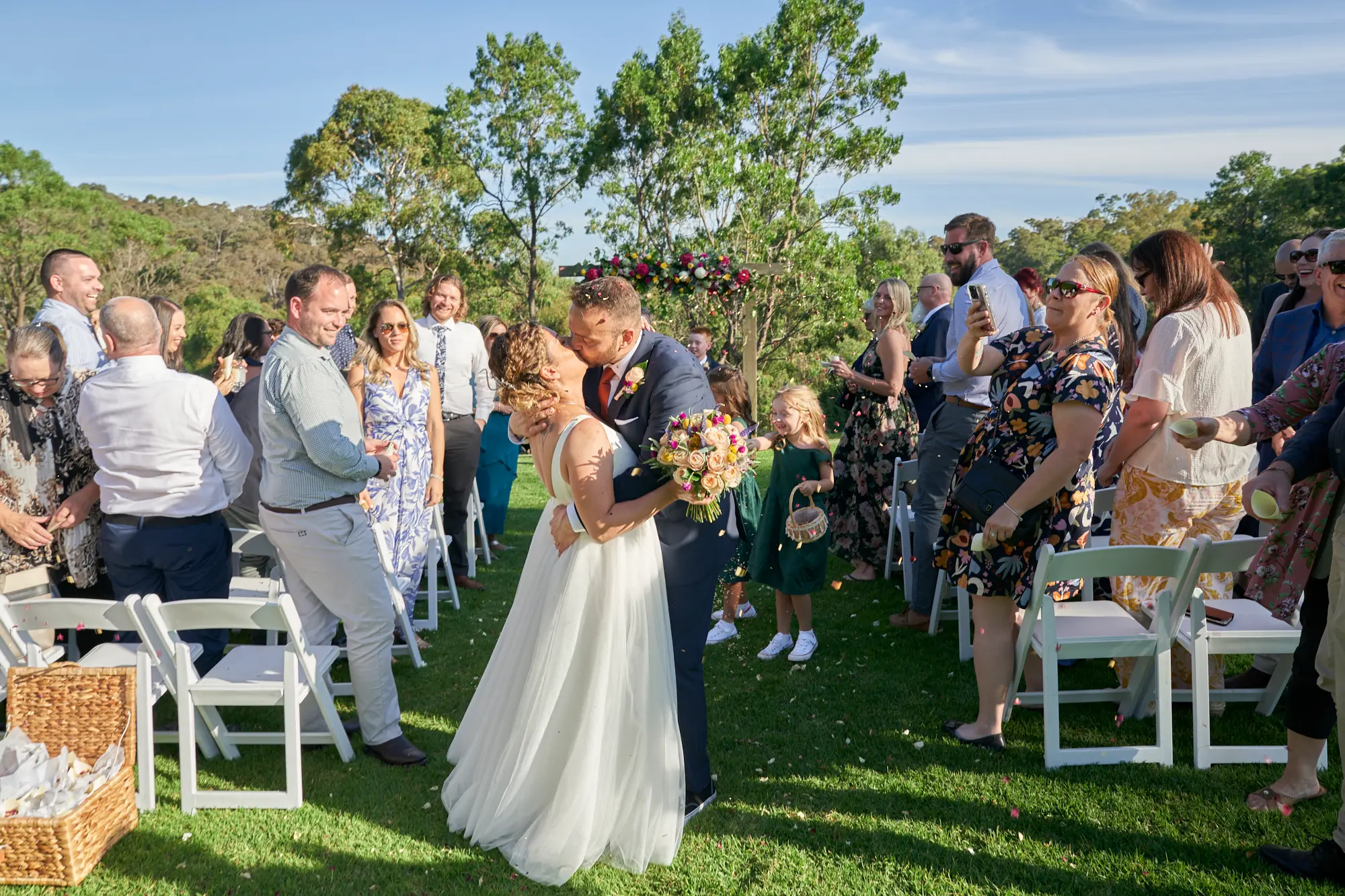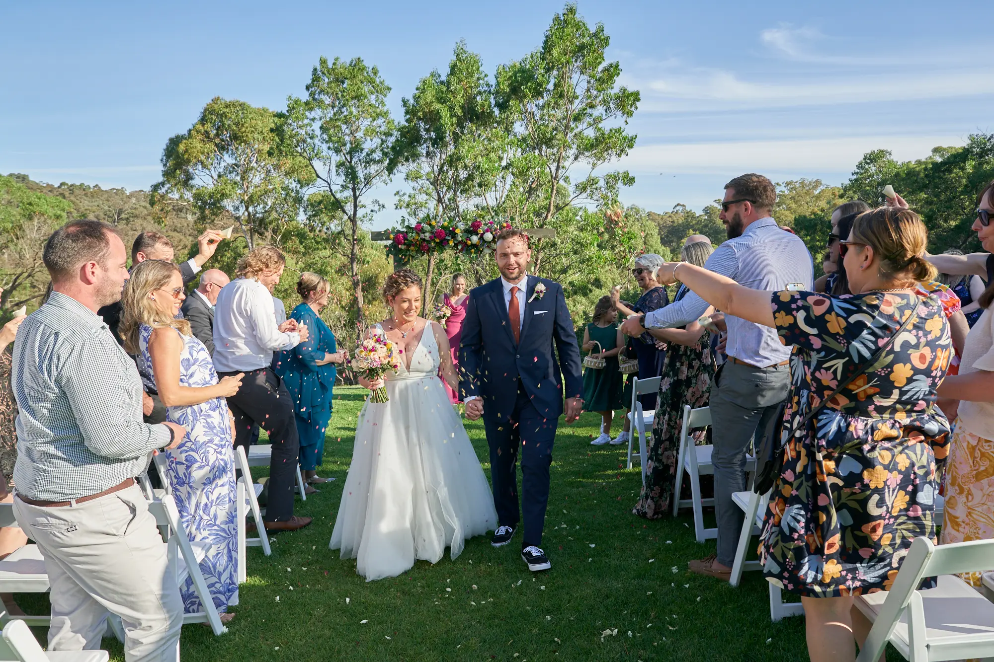 From exchanging rings and their first kiss to signing the wedding certificate, every moment felt relaxed and heartfelt. The ceremony ended with confetti floating through the air as they walked back down the aisle together.