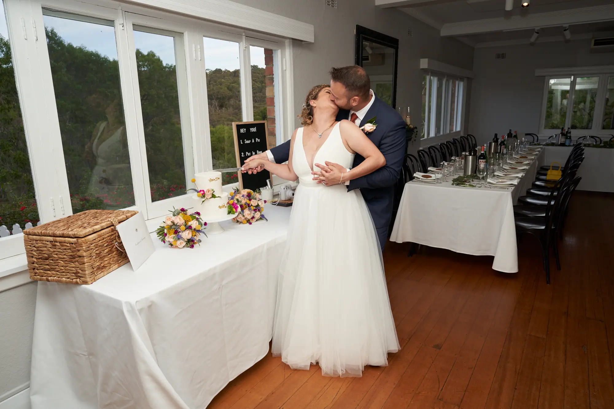 The wedding reception at Farm Vigano unfolded in the intimate Gardens Room, filled with warmth and beautiful scenery. Before guests entered, I photographed the carefully styled setup — close-ups of florals, gum tree leaves on the tables, elegant place settings, and the wedding cake waiting to be cut. As Allison and Christian entered the room, the atmosphere shifted into celebration, filled with smiles and quiet excitement. I captured their cake cutting, a sweet kiss shared between them, and candid moments with guests throughout the evening. These photographs preserve the feeling of an intimate celebration, where every detail and interaction felt personal and meaningful.