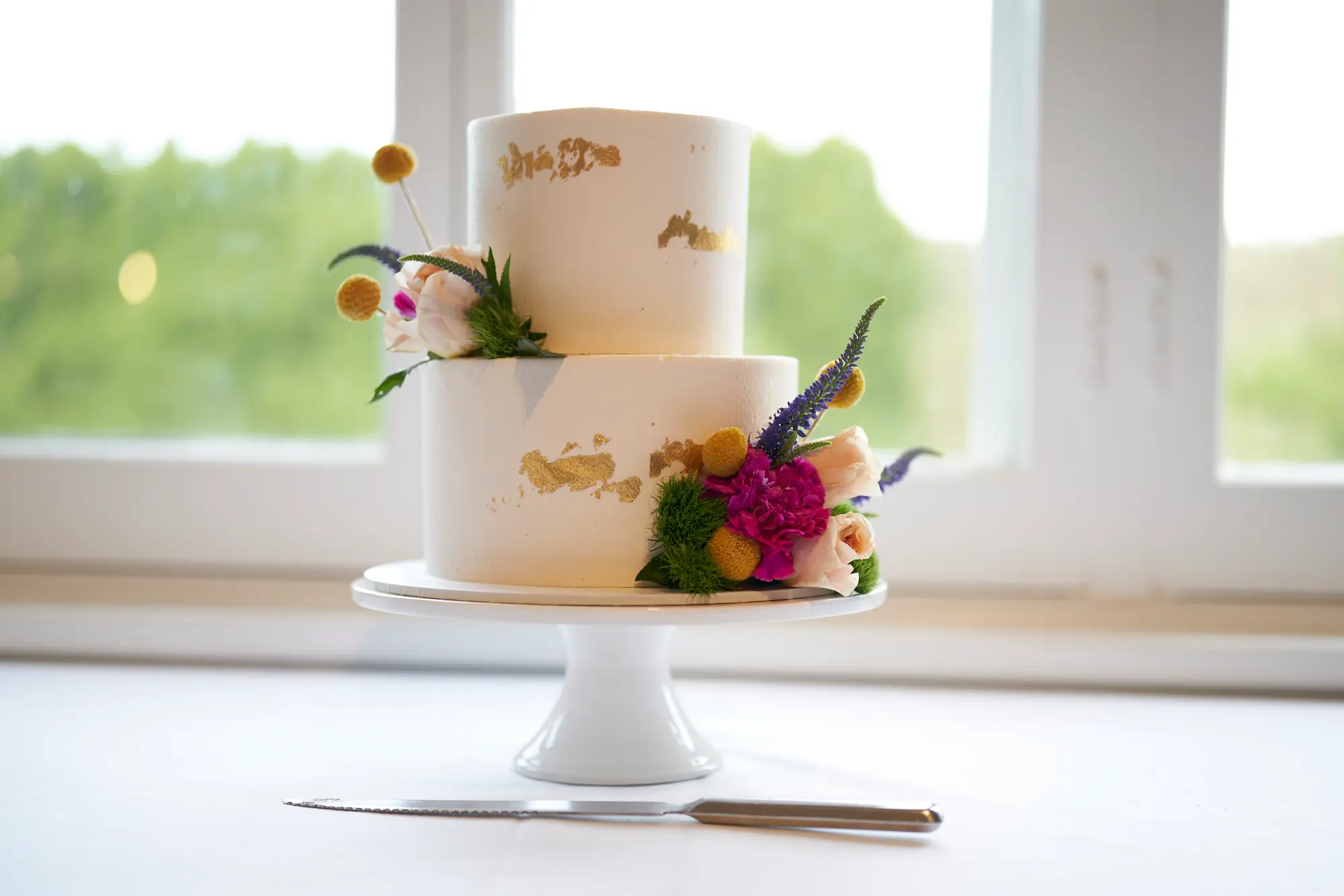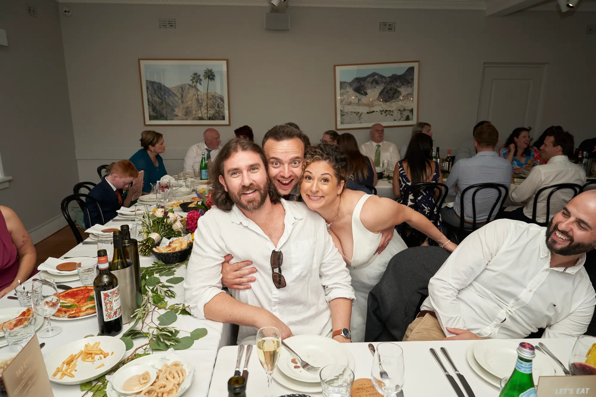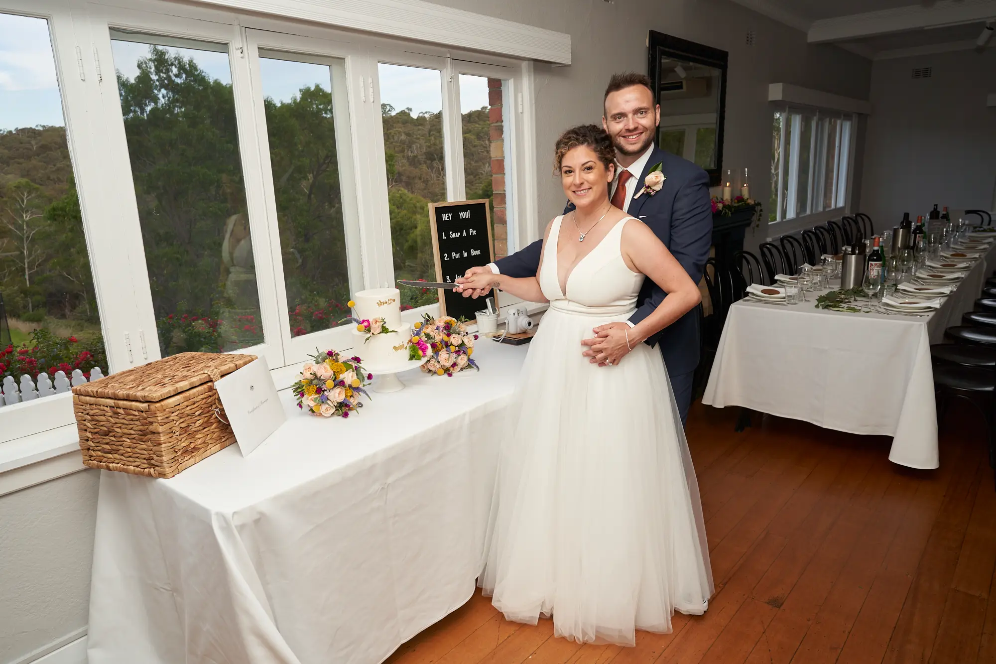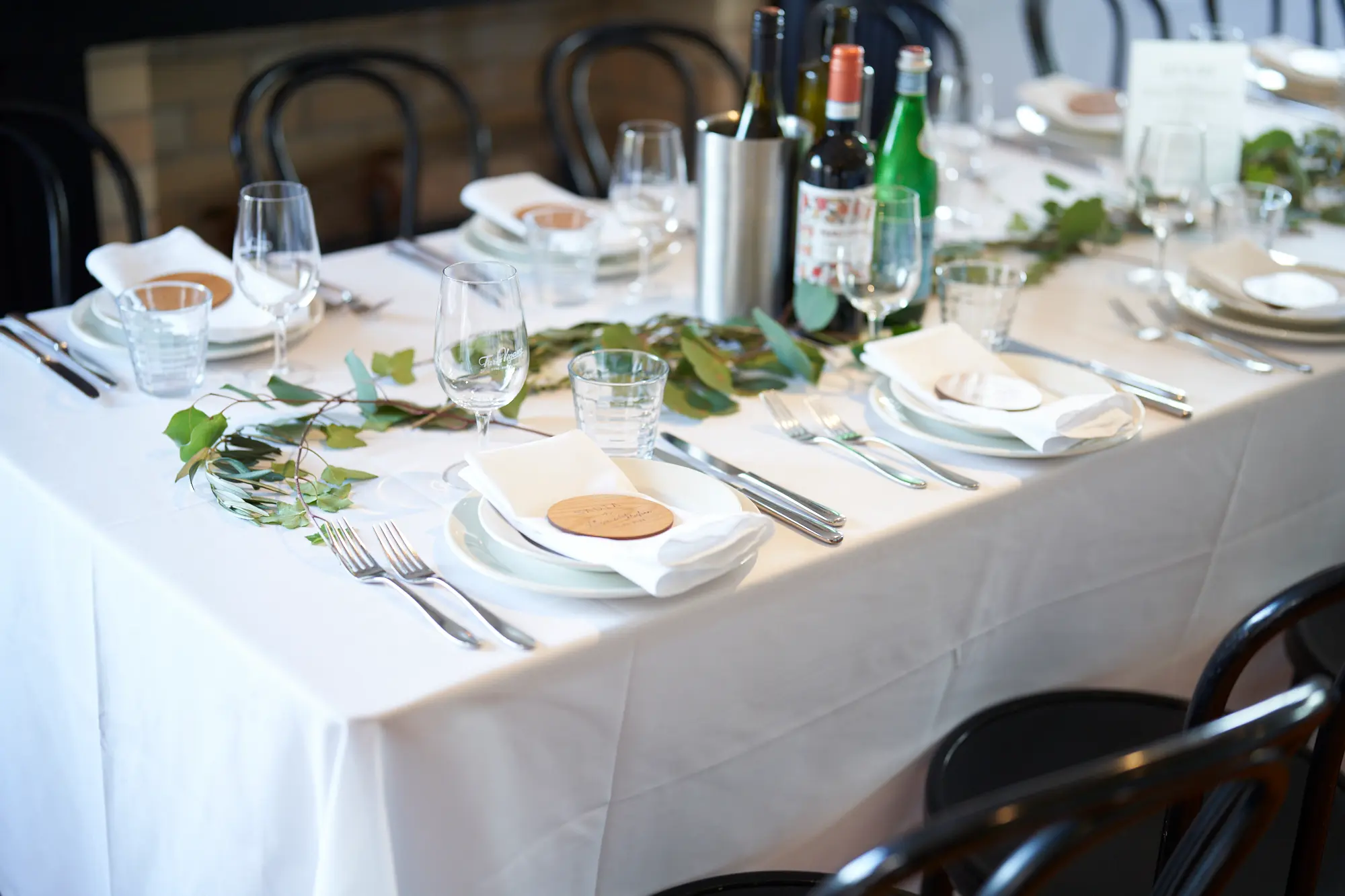 Before guests entered, I photographed the room as it was carefully styled — from the floral arrangements and gum tree leaves on the tables to the beautifully set place settings and wedding cake.