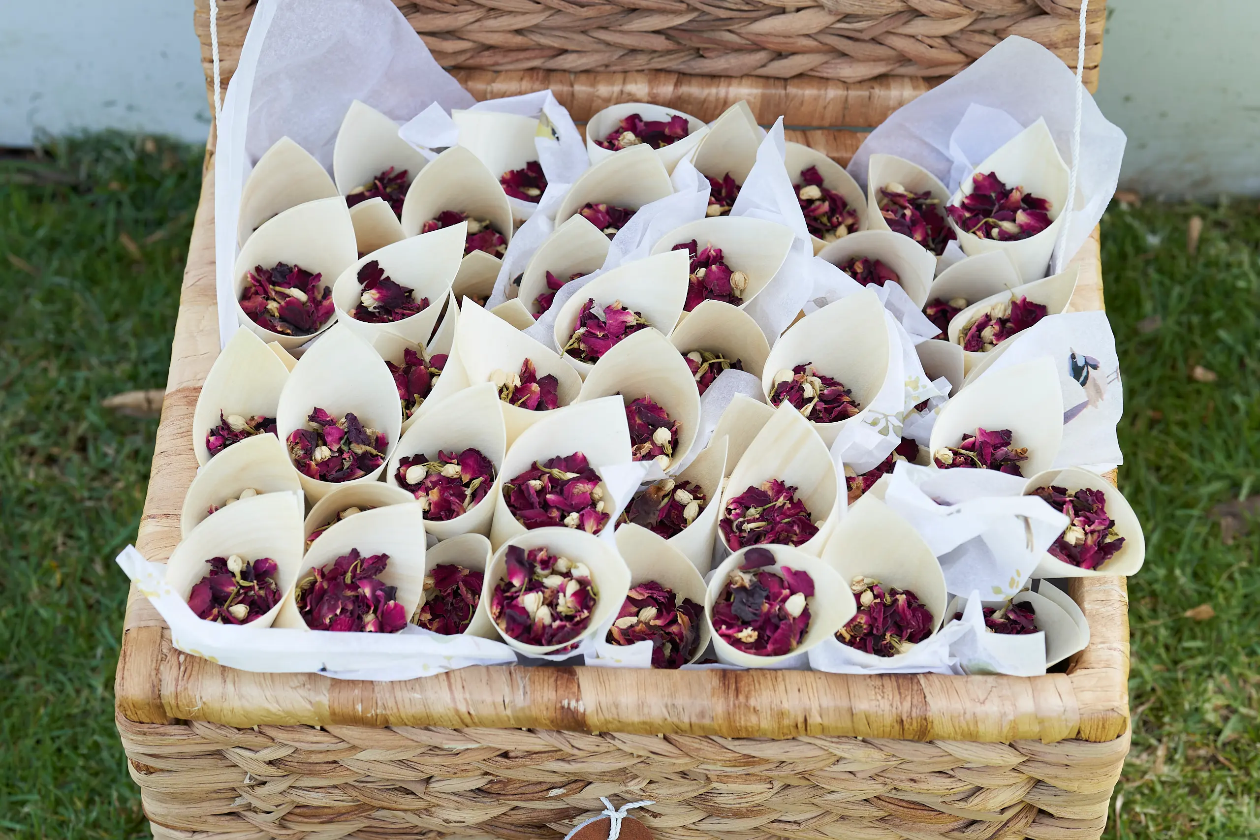 Before Allison and Christian’s ceremony at Farm Vigano, I photographed the carefully styled ceremony setup, including the wedding arch, rows of chairs, and thoughtful details such as the wicker basket filled with confetti cones.