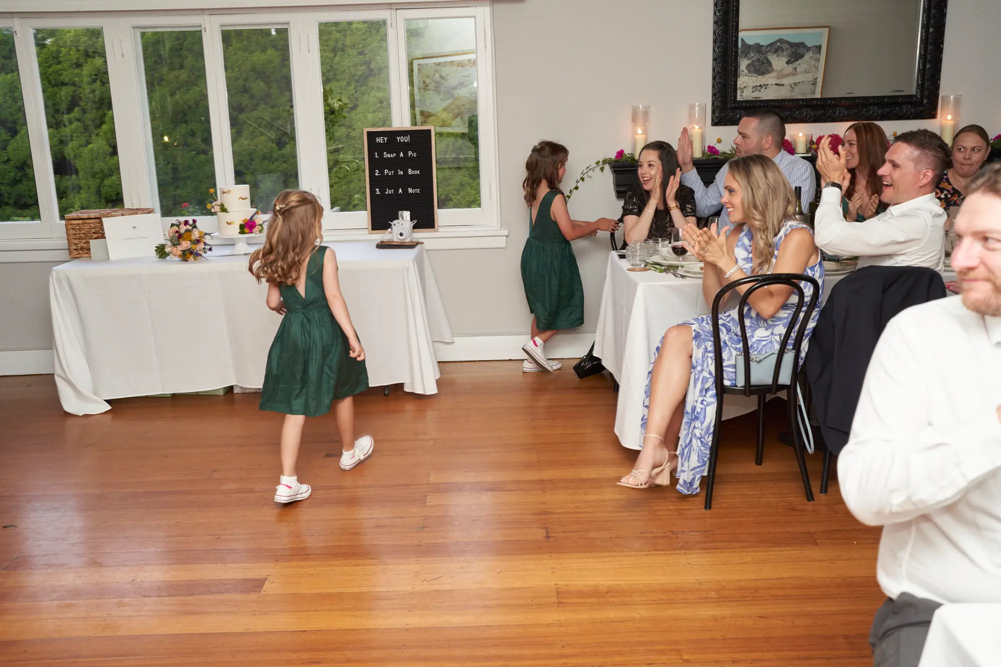 An intimate Garden Room reception unfolds with thoughtful details, joyful entrances, cake cutting, and shared kisses surrounded by loved ones.