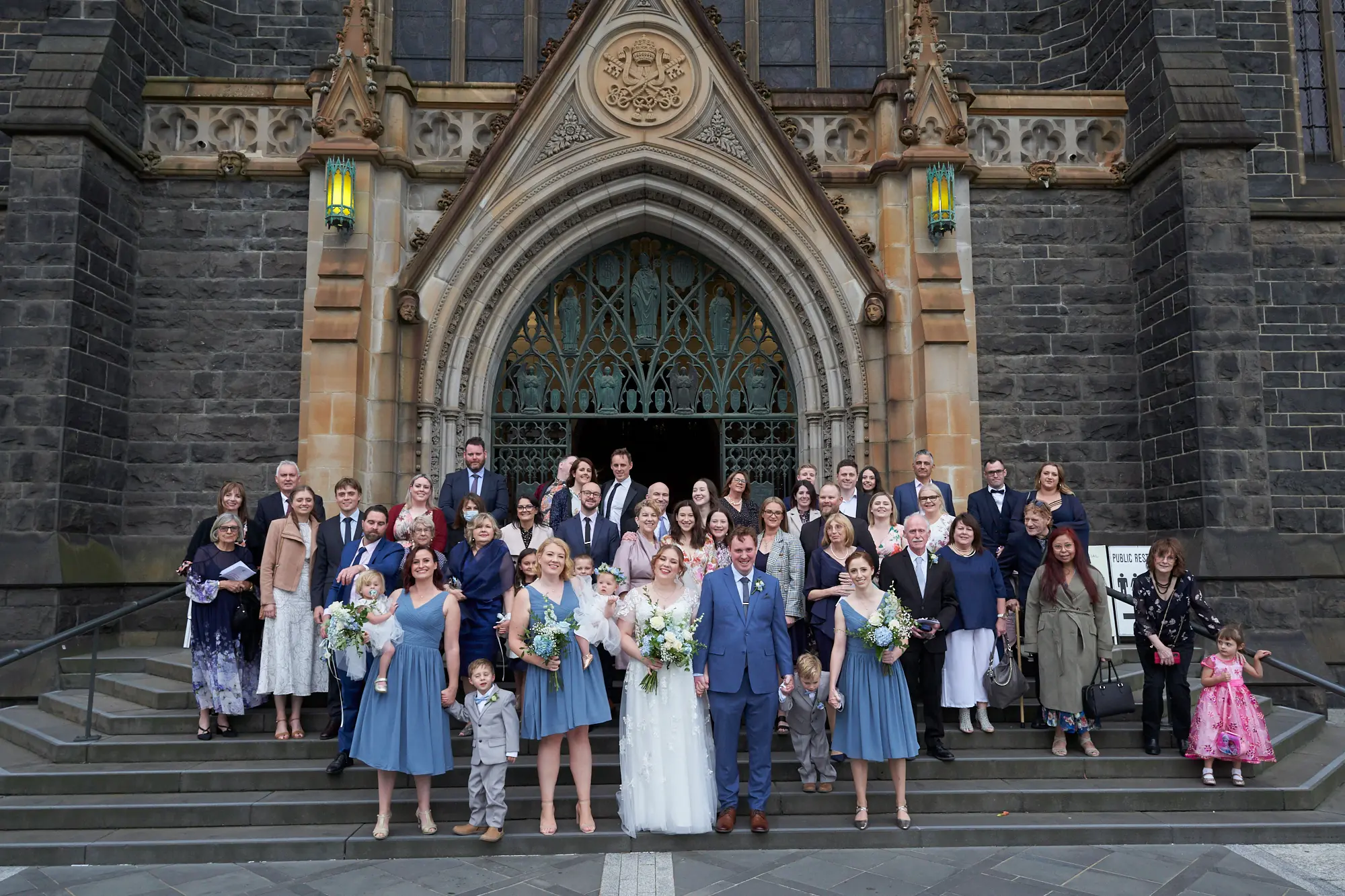 After the ceremony, we moved to the front steps of St Patrick’s Cathedral Melbourne to capture family and group portraits against one of the most impressive Gothic Revival façades in Australia.
