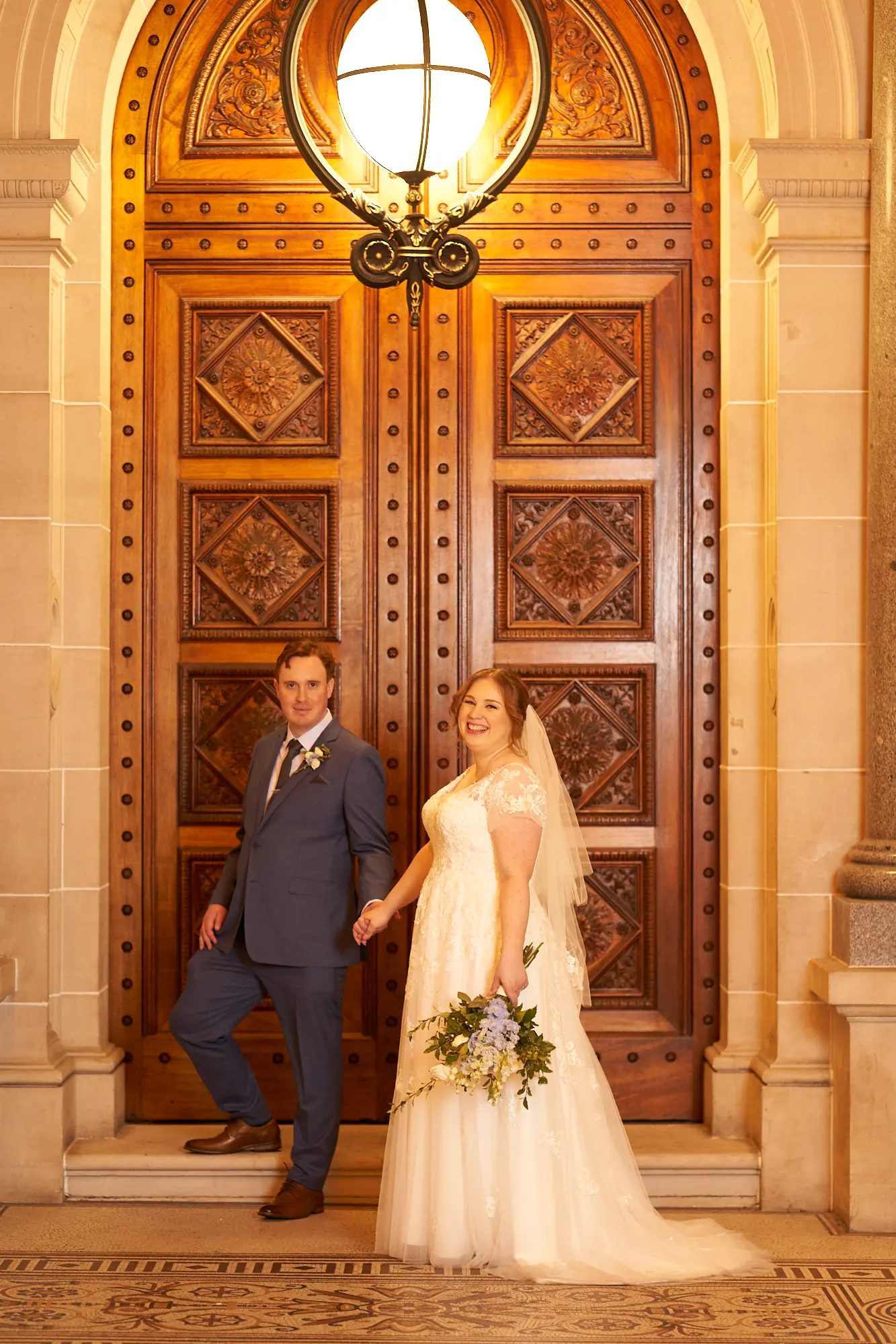 This portrait captures Emily and Declan in one of St Patrick’s Cathedral’s most enchanting spaces — the smaller side entrance framed by rich Gothic detail. The towering bluestone façade, intricate arches, and large lancet window create a dramatic architectural backdrop, while the cascading fountain adds movement and softness to the scene. Standing hand in hand at the heart of this composition, the couple becomes the perfect contrast to the cathedral’s grand presence. The result is a portrait that feels timeless, serene, and deeply romantic, beautifully blending Melbourne’s historic charm with genuine emotion.To finish the session, we moved to Parliament House of Victoria, where the carved wooden doors and iconic hanging lamp provided a majestic, sophisticated backdrop that completed their cinematic wedding story.