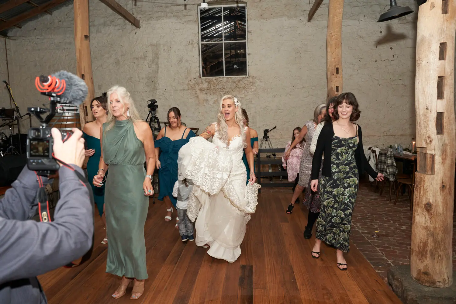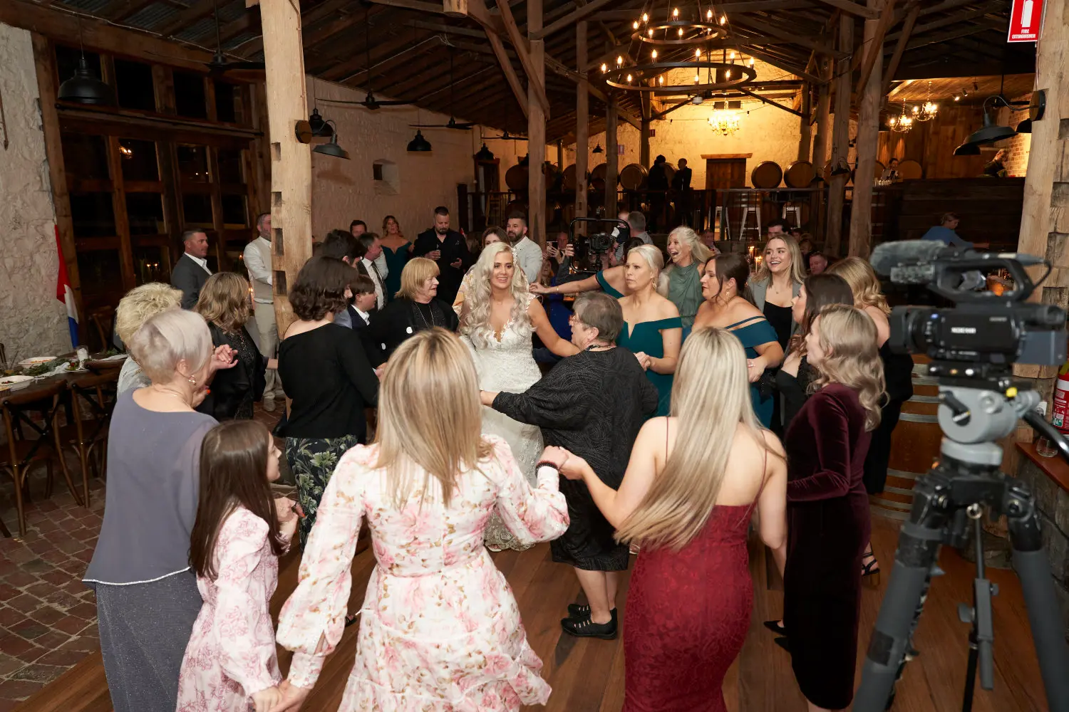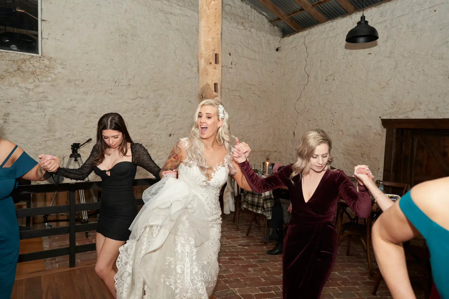 From wide shots that reveal the rustic hall glowing under soft, golden light to intimate frames of the bride laughing and holding hands with friends, these moments capture the energy that defined the night. Guests gathered in circles, clapping, smiling, and dancing together, filling the space with joy that was both vibrant and heartfelt.