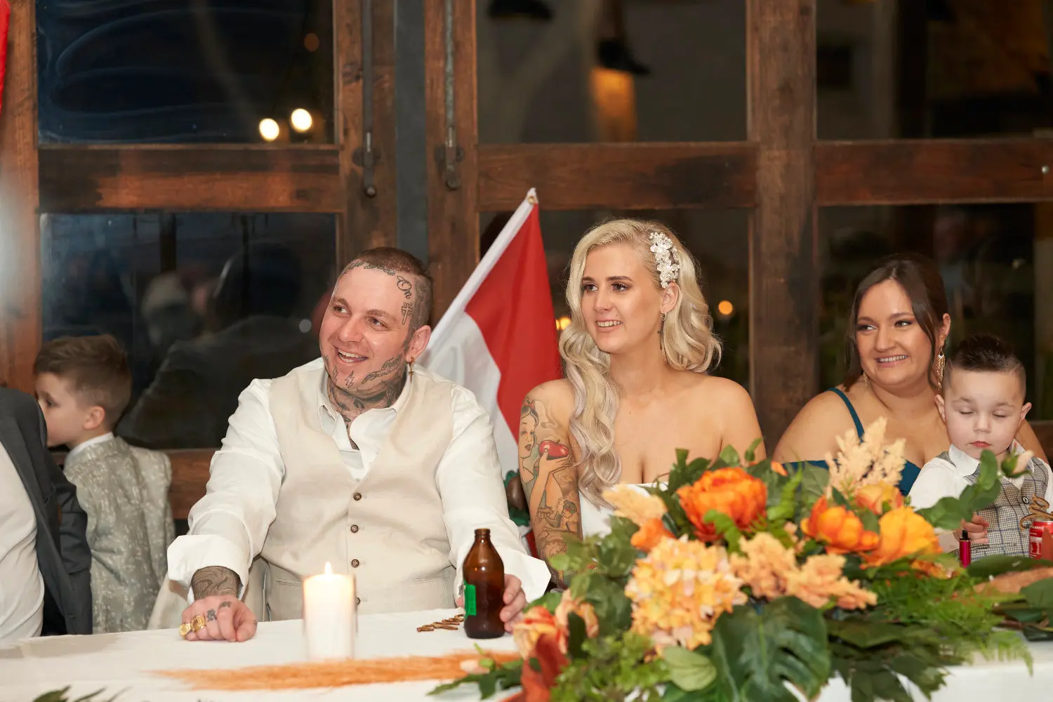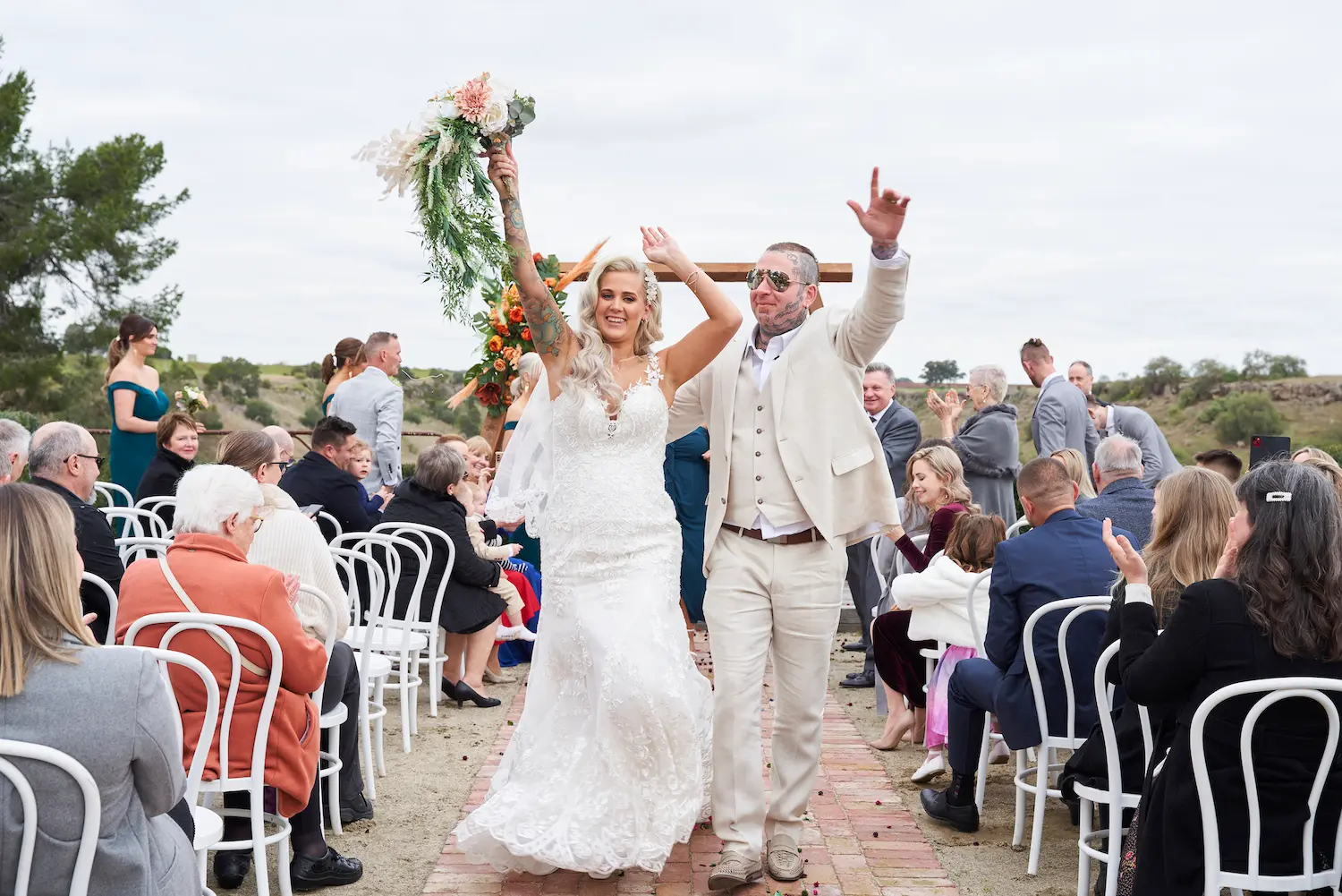 With the sweeping valley views behind them, it was a picture of pure happiness. One particularly sweet moment came when a little flower girl ran out to greet the newlyweds, bringing laughter and joy to everyone watching. As the couple began their walk back down the aisle, guests rose to their feet, clapping and cheering with excitement.