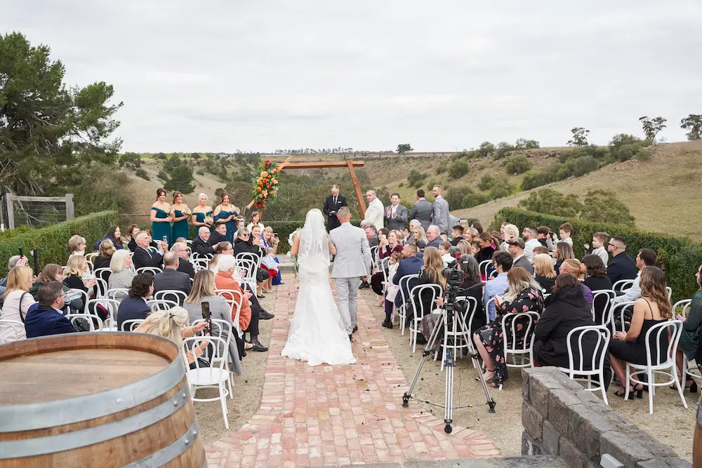 A heartfelt walk down the aisle, filled with smiles, tender glances, and the breathtaking countryside views of Warrawong Estate.