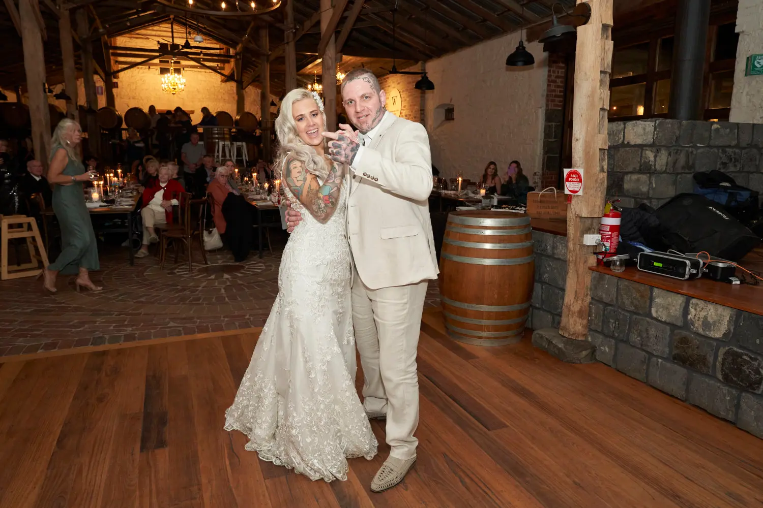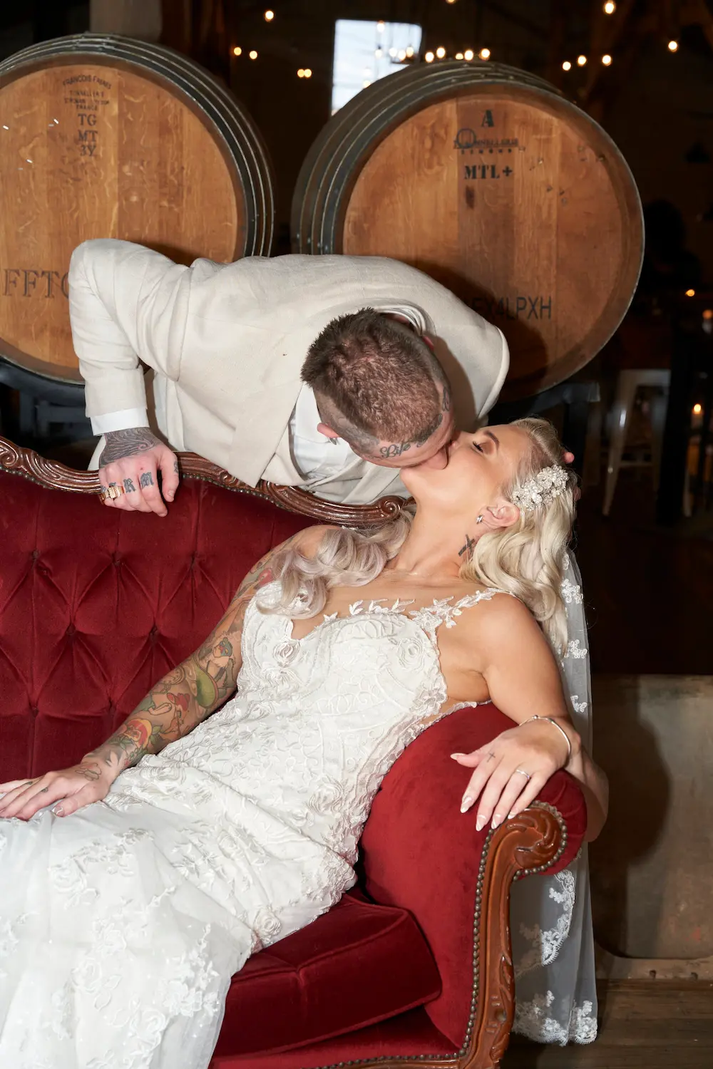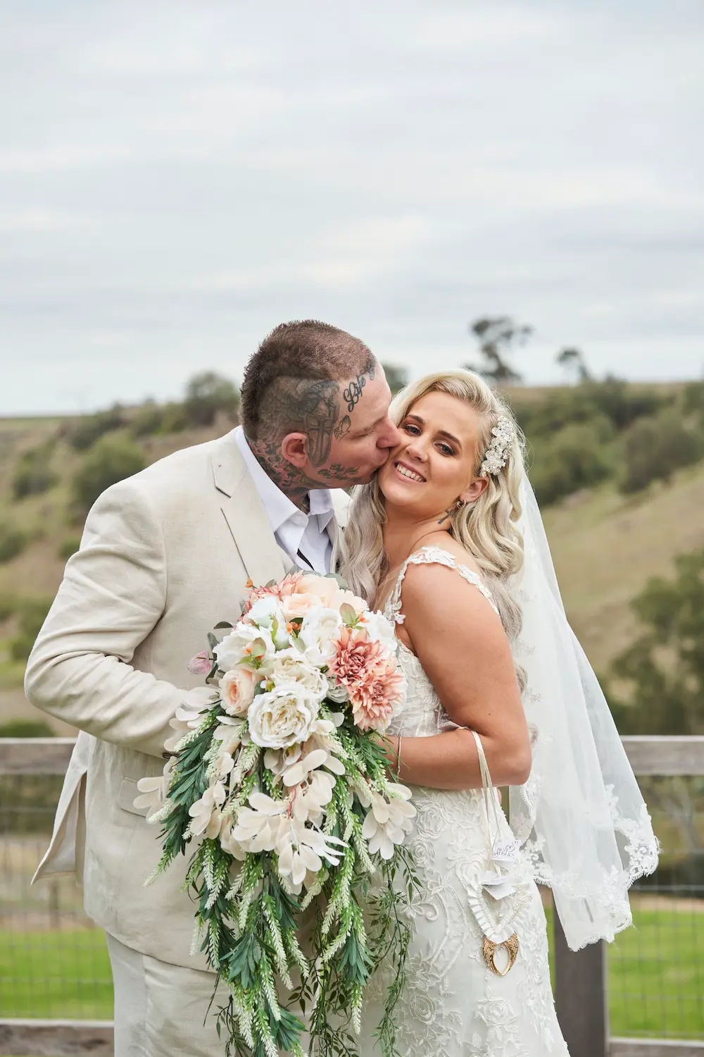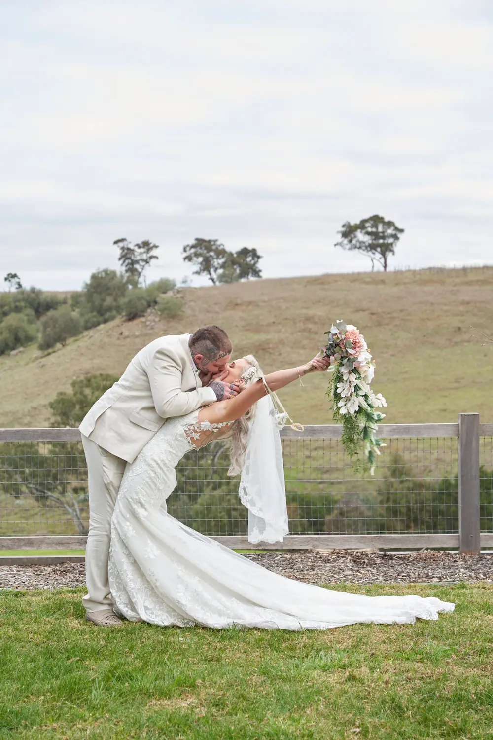 On the hilltop, Emma and Darko shared timeless portraits framed by sweeping landscapes, their romance set against rolling hills and open skies. Later, at the rustic Woolshed, the mood shifted into warm, intimate frames with vintage charm. From cinematic smoke-filled moments to tender kisses, these portraits beautifully balanced elegance and authenticity, capturing the couple’s story in settings that highlight both natural beauty and the rustic soul of Warrawong Estate.