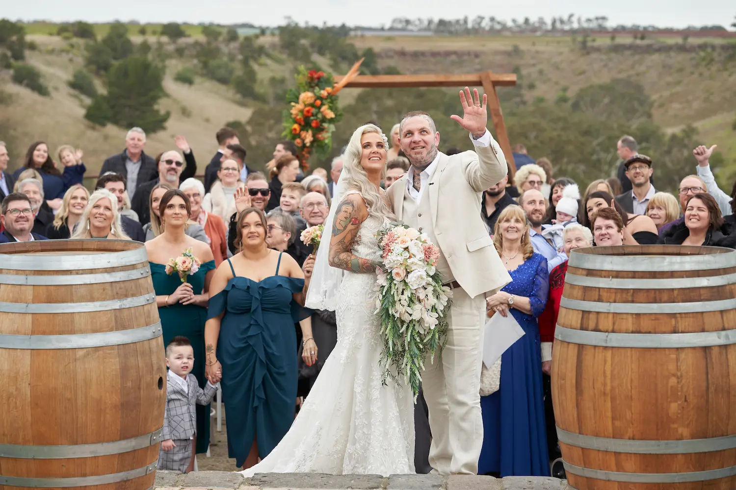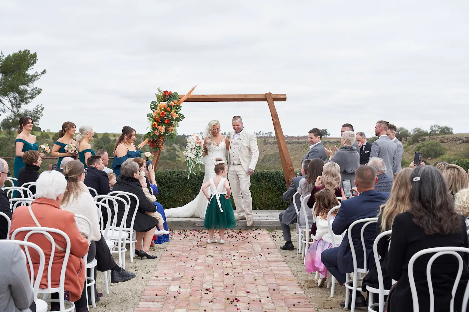 The bride’s arrival at Warrawong Estate was filled with tender, unforgettable moments. From the flower girls and ring bearer leading the way, to the bride walking hand-in-hand with her father, every step carried deep emotion. Guests smiled, cheered, and captured the moment on their phones, while the valley views framed the ceremony beautifully. One of the most touching highlights was the father shaking the groom’s hand beneath the rustic wedding arch.