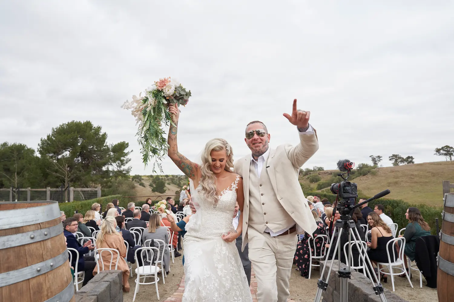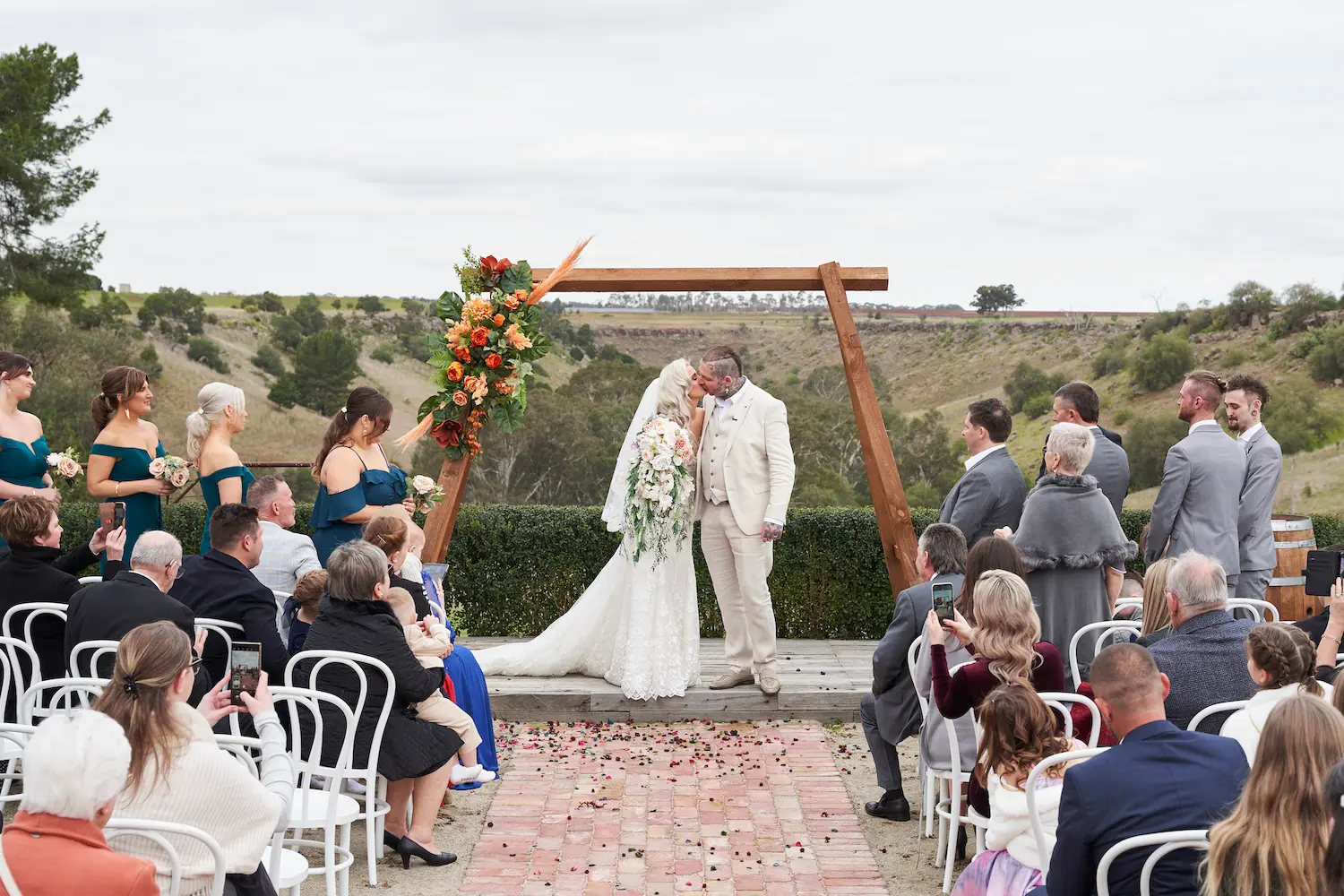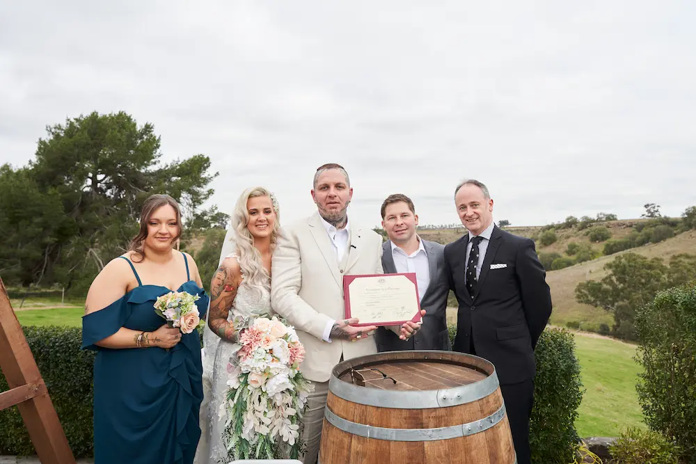 The first kiss as husband and wife brought a wave of applause and celebration, followed by warm embraces from family and friends. Even the signing of the marriage certificate felt timeless, framed by the stunning countryside views. These are the moments that define wedding photography in Melbourne — a mix of candid emotion and sweeping landscapes that tell a couple’s story forever.
