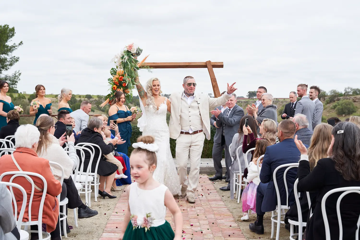 Emma and Darko’s joyful recessional at Warrawong Estate was one of the most vibrant parts of the day. Guests clapped, cheered, and reached out to congratulate the newlyweds as they walked hand in hand down the aisle. From the tender kiss beneath the arch to the sweet flower girl moment, every detail reflected happiness. These images combine candid storytelling with stunning landscapes, a perfect example of natural and timeless wedding photography.
