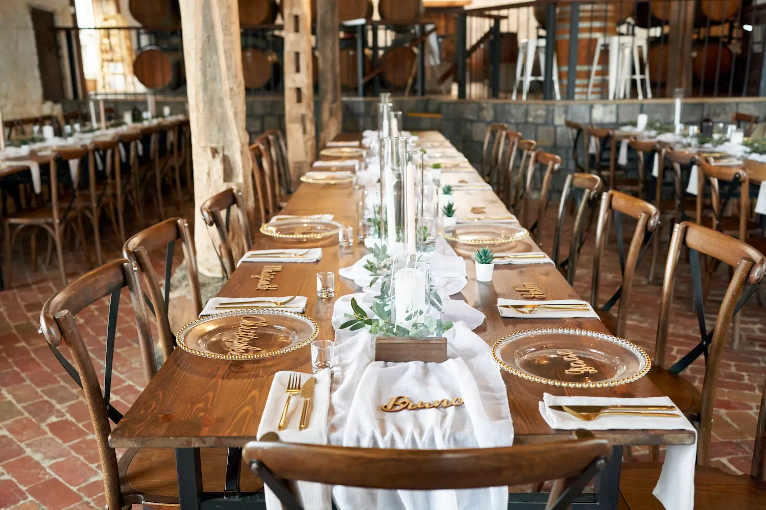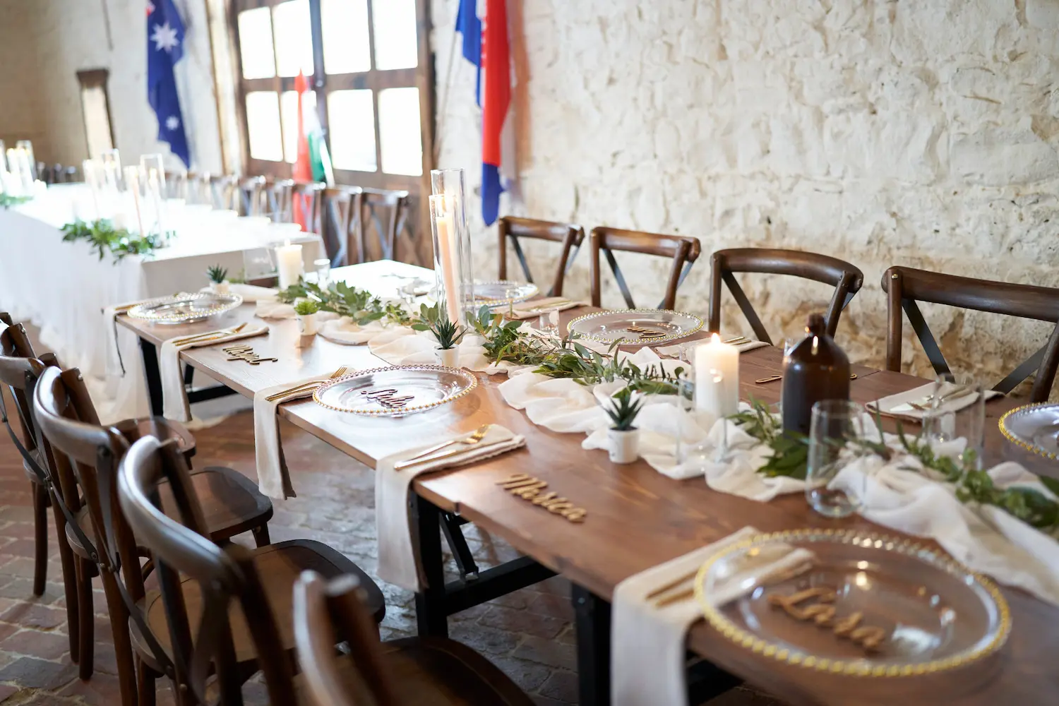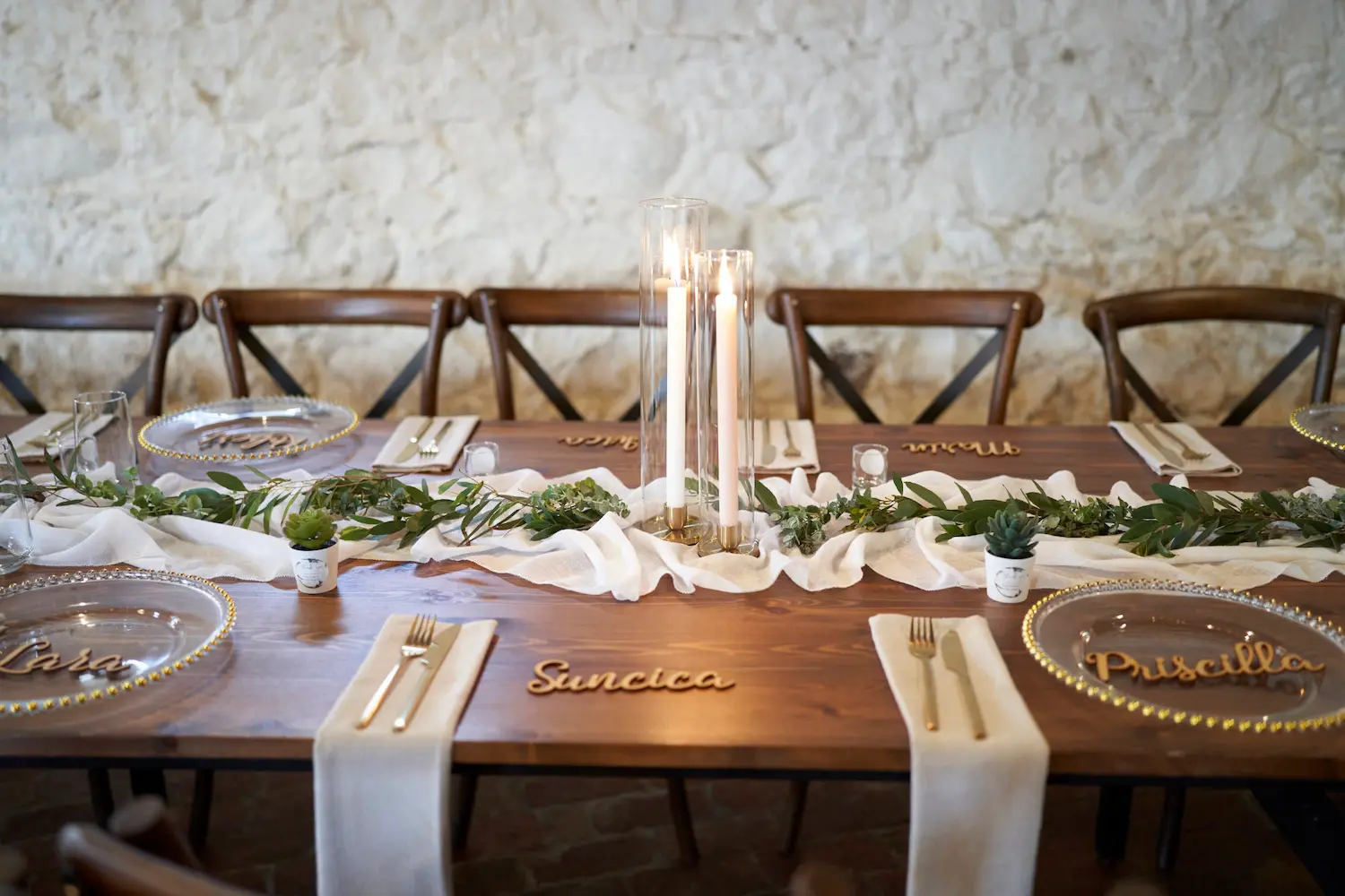 Long wooden tables were dressed with flowing white runners, soft greenery, and clusters of glowing candles, creating a warm and welcoming atmosphere. Each place setting was thoughtfully styled, with delicate details like name plates and elegant glass chargers that made every guest feel special. The stone walls and exposed timber beams added character to the space, enhancing the natural and organic mood of the celebration.