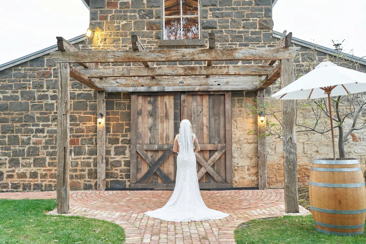 The second location, the rustic Woolshed, offered a completely different atmosphere — one filled with vintage charm and character. With its weathered brick walls, timber beams, and large wooden doors, it provided a textured setting for classic, heartfelt portraits. Together, these two locations told a complete visual story of romance, blending natural beauty with heritage charm in a way that felt both authentic and unforgettable.