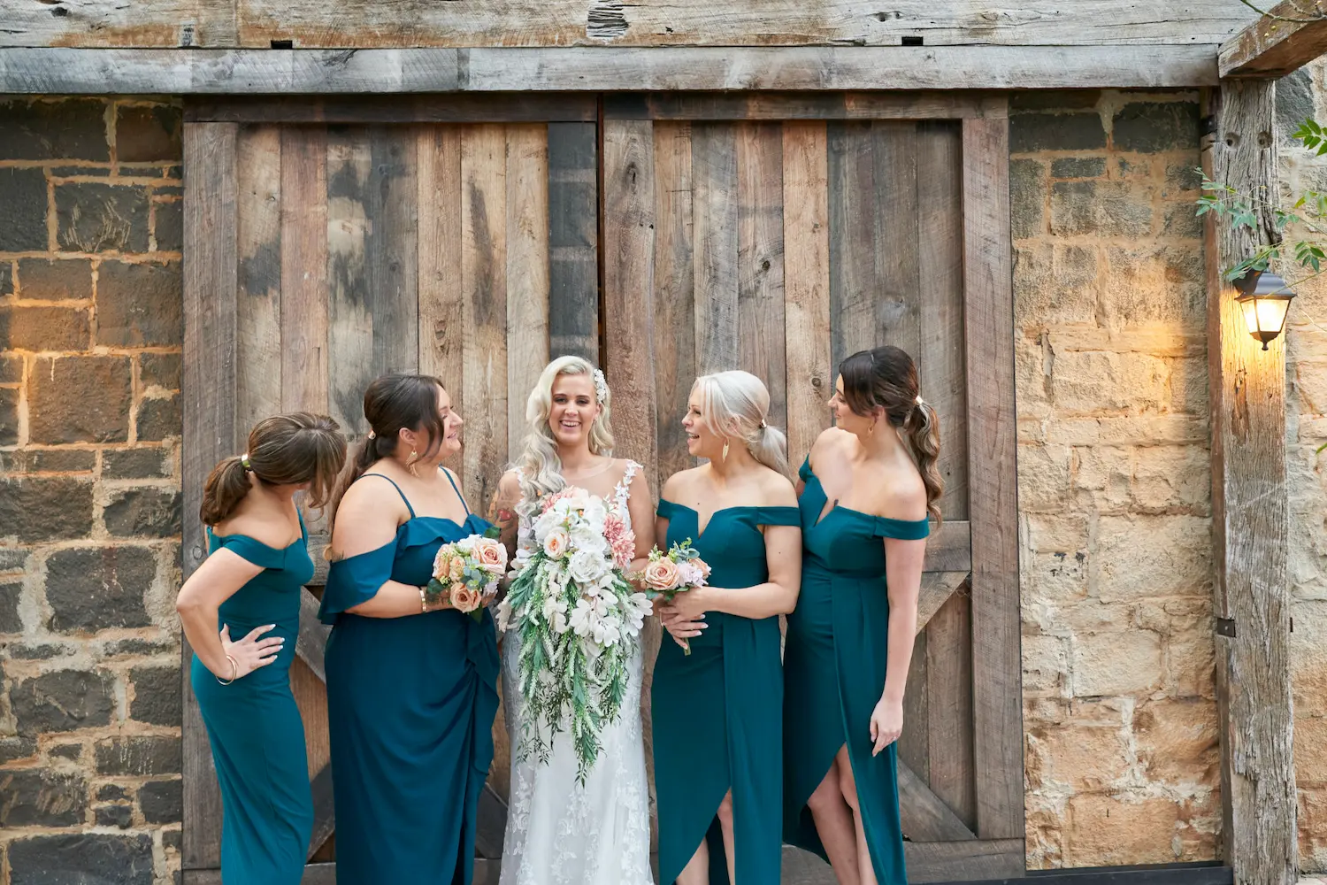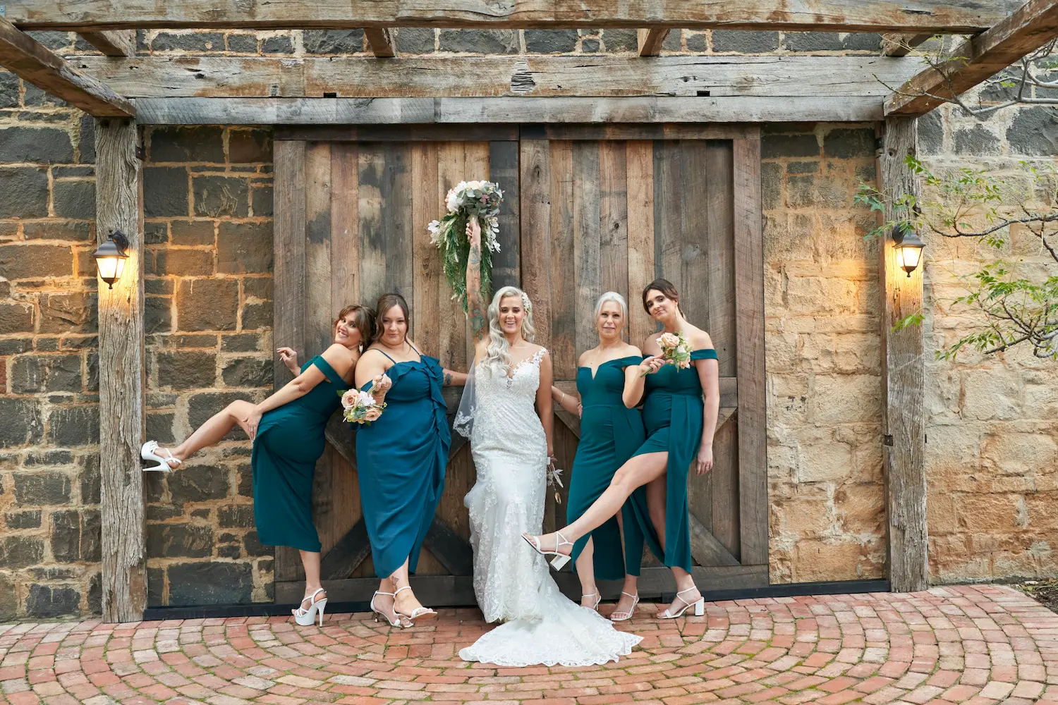 The second location brought a different atmosphere — the rustic Woolshed, with its brick walls, timber beams, and vintage doors. Here, the portraits carried a warm, nostalgic charm, with the bride posing gracefully as well as lighthearted moments between her bridesmaids. Together, these portraits highlight not only the bond of friendship but also the artistry of capturing wedding photography, balancing natural scenery with rustic architecture for a timeless collection.