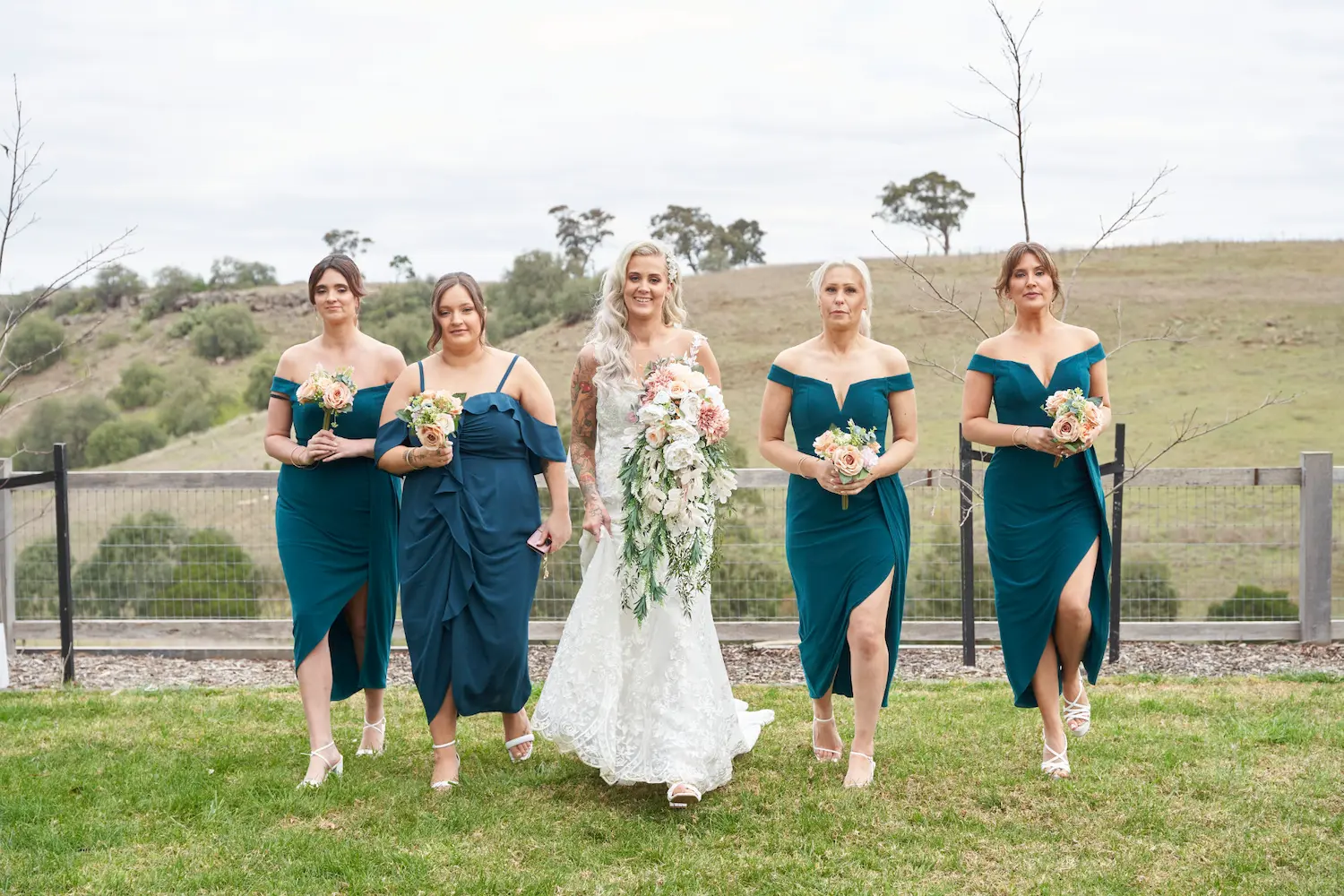 The bride and her bridesmaids shared moments that were both elegant and full of laughter. On the hilltop, with sweeping views of the surrounding valleys, their portraits reflected timeless beauty against a breathtaking natural backdrop. Later, by the rustic charm of the Woolshed, the atmosphere shifted to something more candid and relaxed — filled with conversation, smiles, and heartfelt bonds that perfectly captured their friendship and joy.