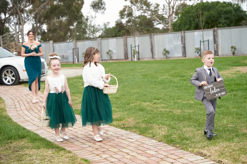 The bridal party portraits at Warrawong Estate perfectly balanced elegance with fun. Starting with formal poses against the rustic Renwick Silos, the group soon shifted into relaxed moments filled with laughter and playful energy. From bridesmaids and groomsmen to the little ones who added extra charm, every photo reflects both style and personality. These images tell the story of friendship, family, and celebration, captured in a natural, storytelling way.