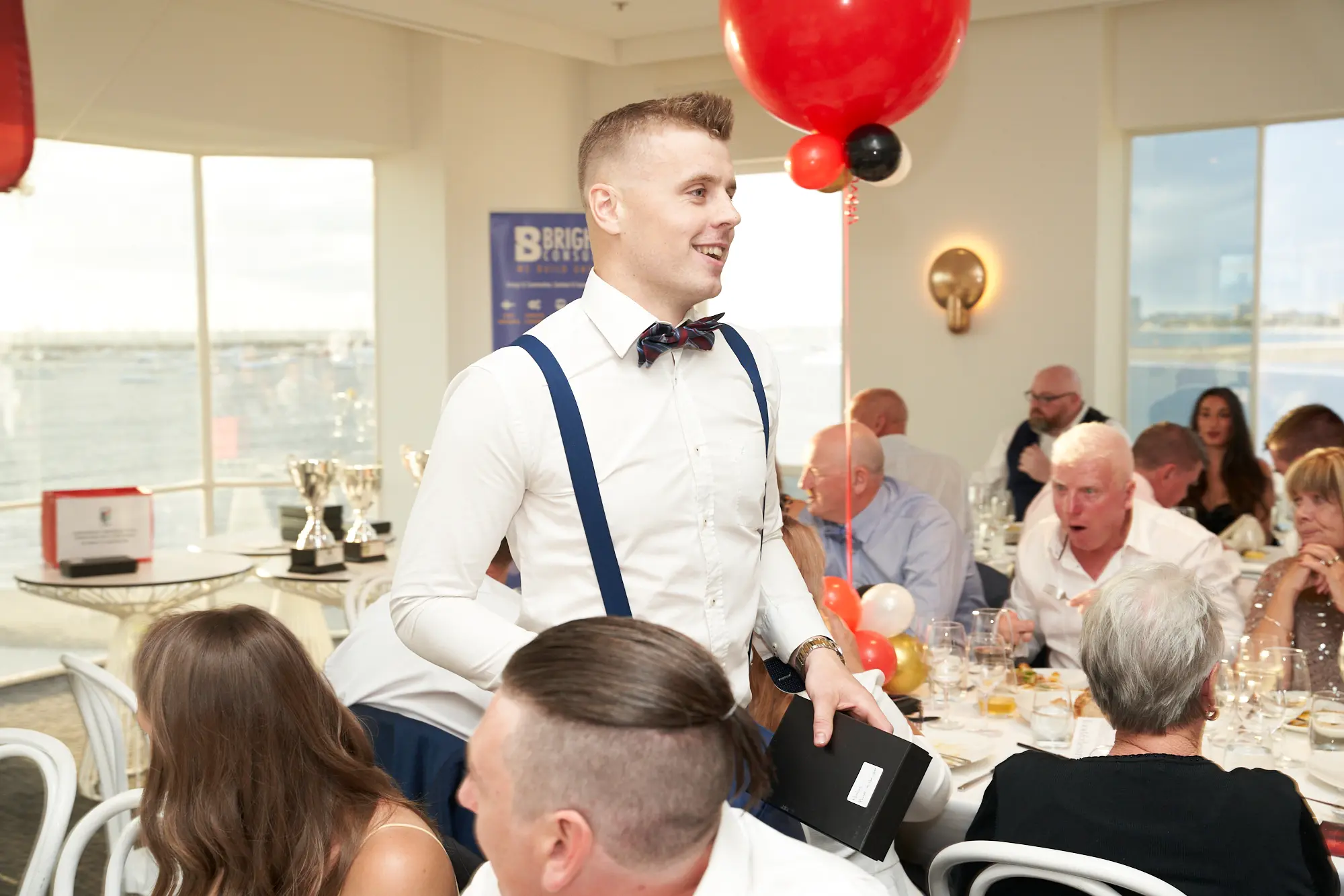 The wide room shot truly highlights the beauty of this venue—elegant tables, modern décor, and stunning sea views framed by floor-to-ceiling glass windows. Through the windows, the scene opens to St Kilda Beach, with glimpses of Melbourne city shimmering in the distance. You can see people strolling along the shoreline, sailboats anchored across the water, and water-sport activities unfolding throughout the afternoon. This dynamic, picturesque backdrop adds a unique charm to the awards night setting. It’s the perfect location for a special occasion, seamlessly blending celebration with the natural beauty and vibrant atmosphere of St Kilda’s coastline.