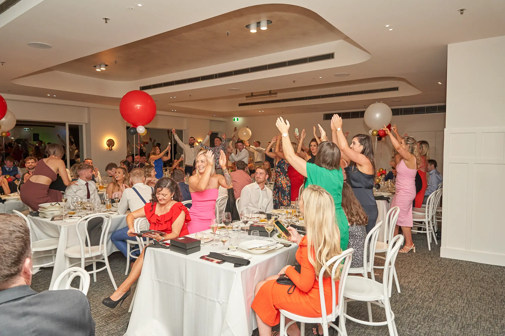 I captured guests leaving their tables to dance, clap, and celebrate together—some even standing on chairs to cheer and film the atmosphere with their phones. Using a mix of wide shots to document the full scene and tighter shots to highlight expressive actions.